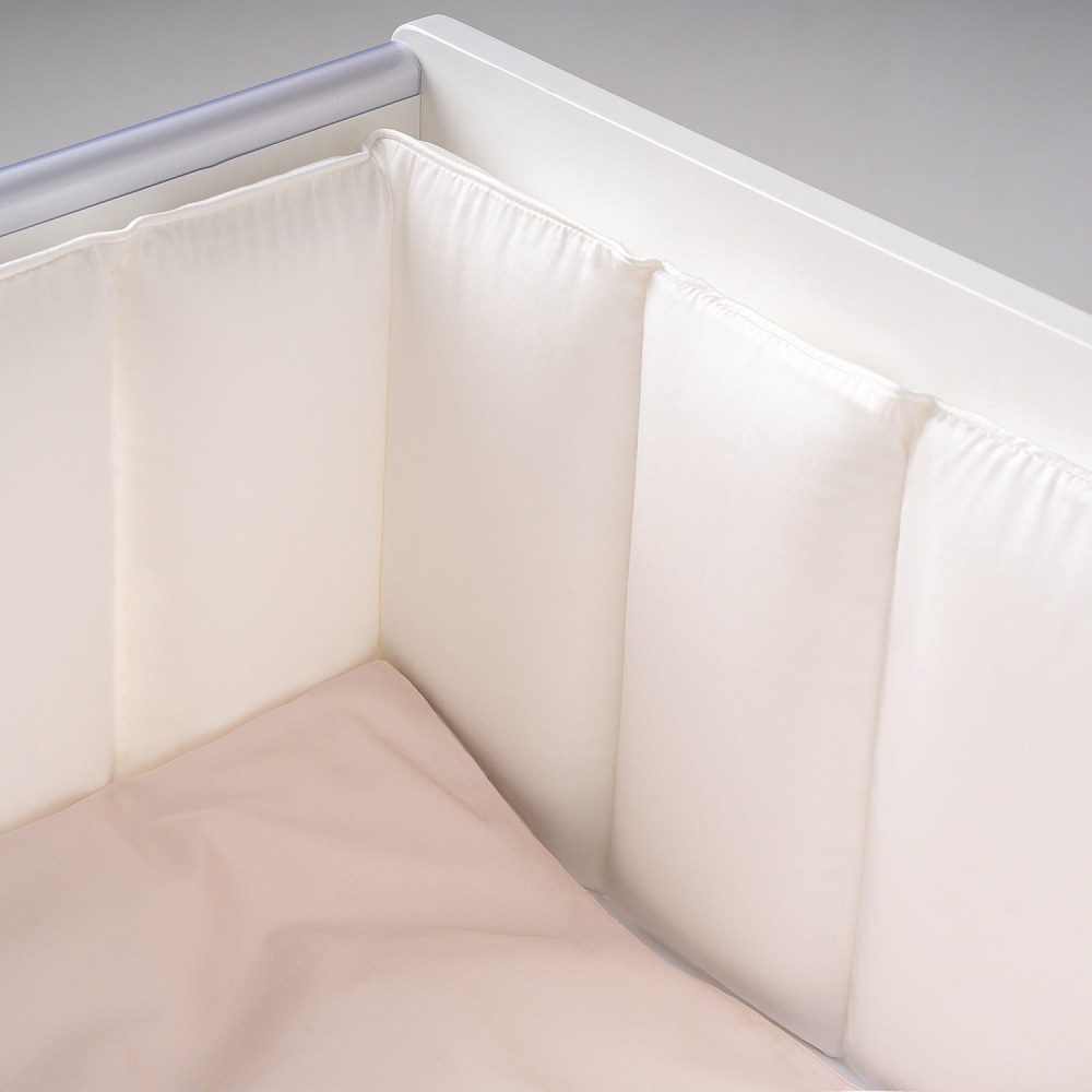Сатиновая премиальная ткань бортиков гладкая и нежная, как шелк. Она не теряет яркость цвета после многократных стирок и хорошо разглаживается. Внутреннее наполнение бортиков - гипоаллергенный материал холлкон. Подушечки из холлкона хорошо пропускают воздух, прекрасно держат форму и не деформируются в процессе эксплуатации.