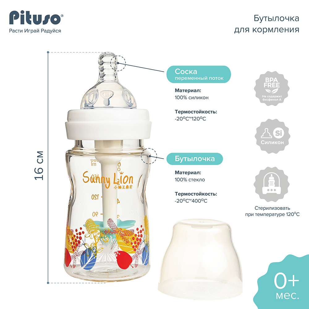 Состав: бутылочка, крышка, горлышко, соска из силикона.