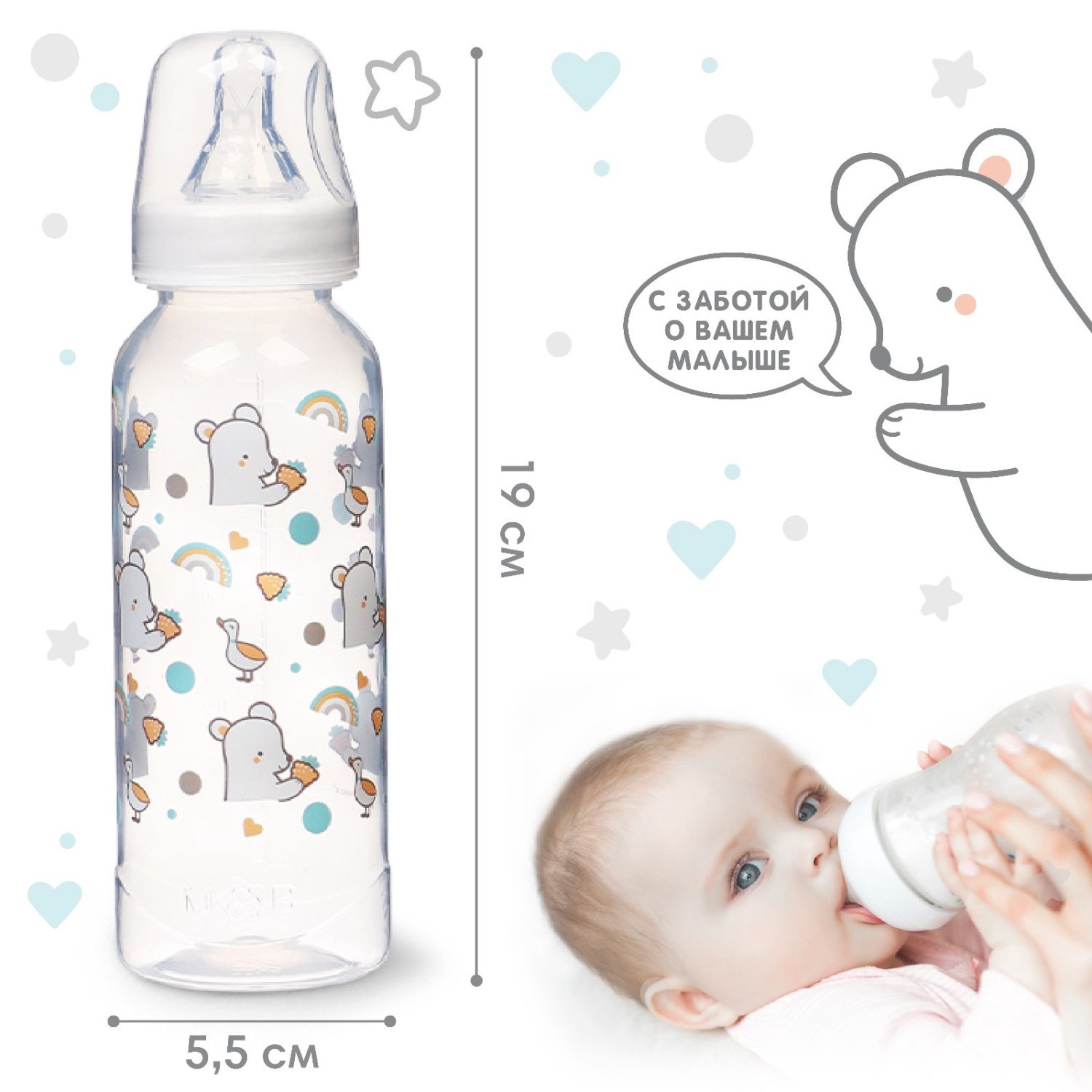 Детская бутылочка изготовлена в России из сырья отечественного производства. Все материалы сертифицированы и безопасны для здоровья новорождённых. Полипропилен и силикон не выделяют вредных веществ при стерилизации и контакте с жидкостью.