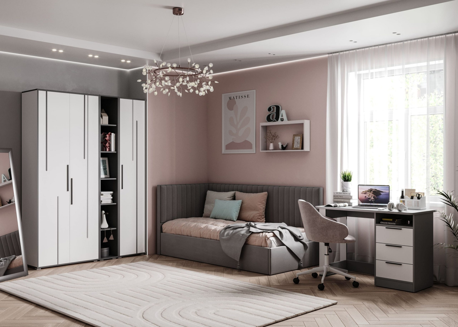 Каркас: ЛДСП (16 мм) «Белый бриллиант», кром. материал (19*1 мм) «Серый графит», ЛДСП (16 мм) «Темно-серый»