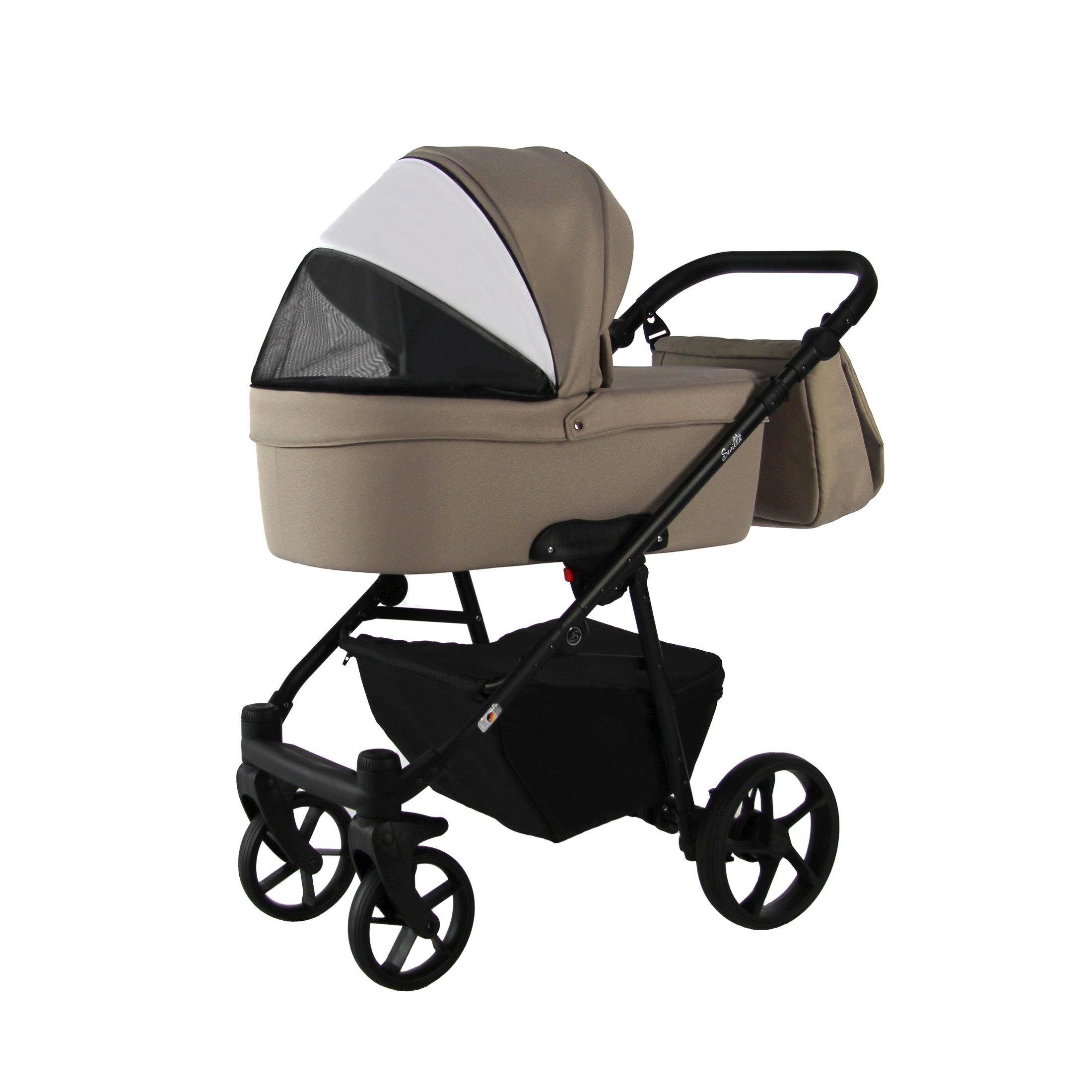Коляска укомплектована стильной вместительной сумкой для мамы, закрытой корзиной для покупок, съёмным держателем для бутылочек, москитной сеткой и плотным дождевиком.