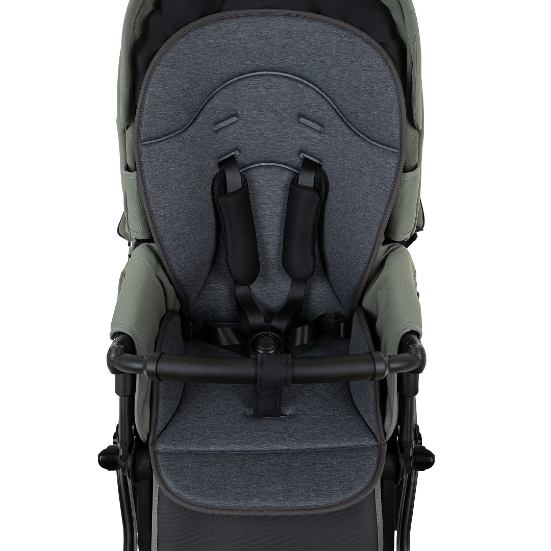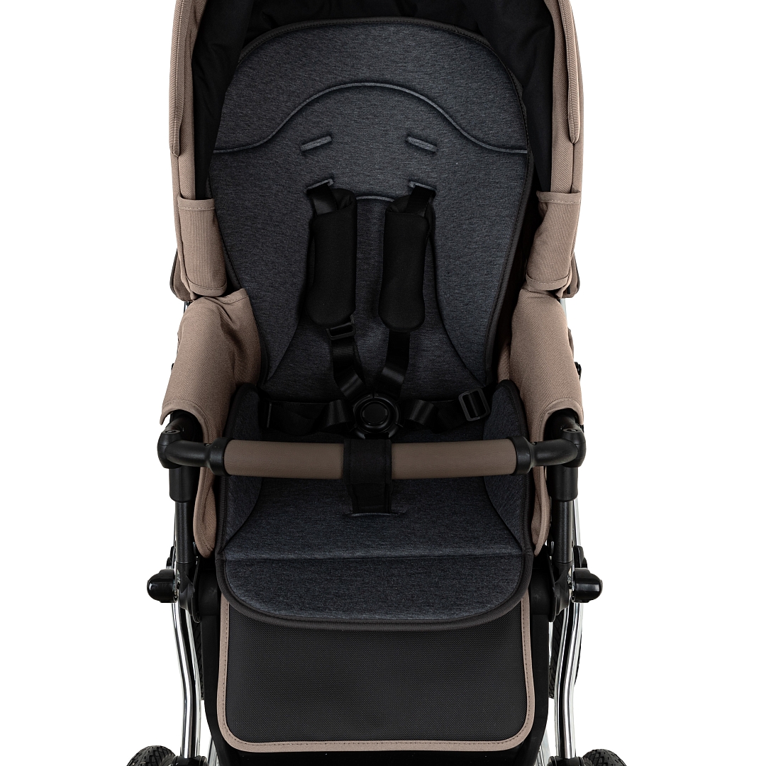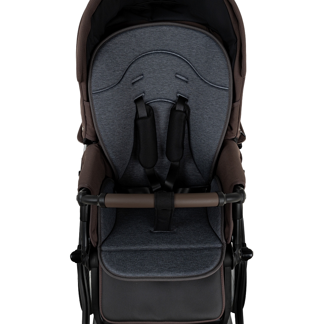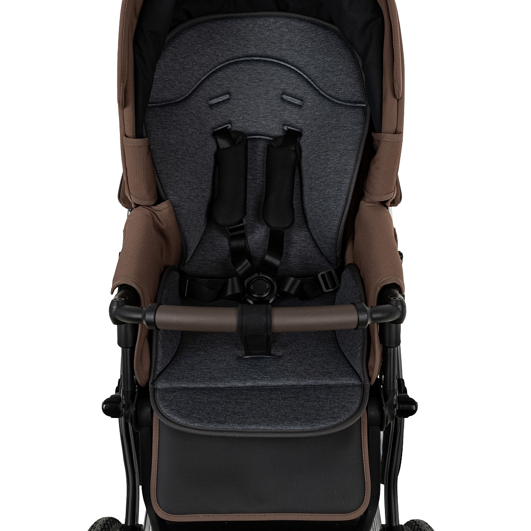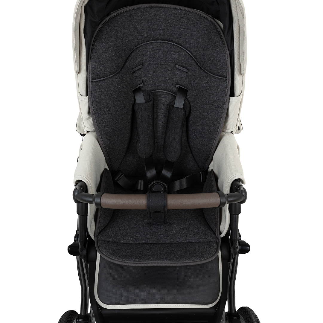 Прогулочный блок имеет пятиточечные ремни безопасности и бампер-ограничитель с отделкой из экокожи. Бампер можно отсоединить с одной стороны и просто откинуть для удобства посадки ребенка.