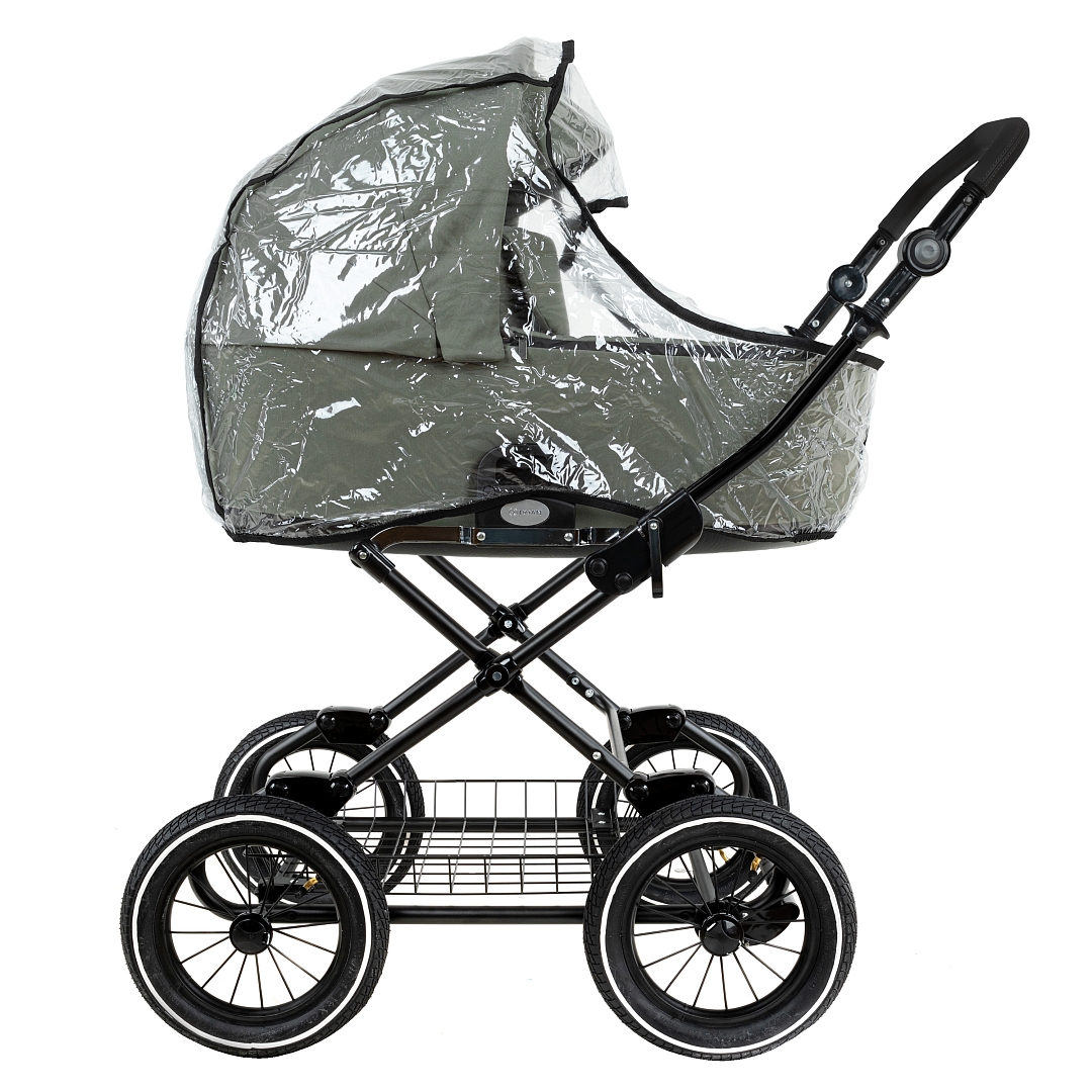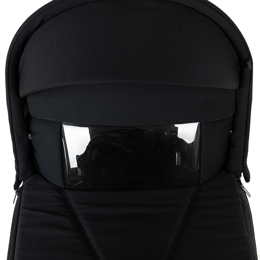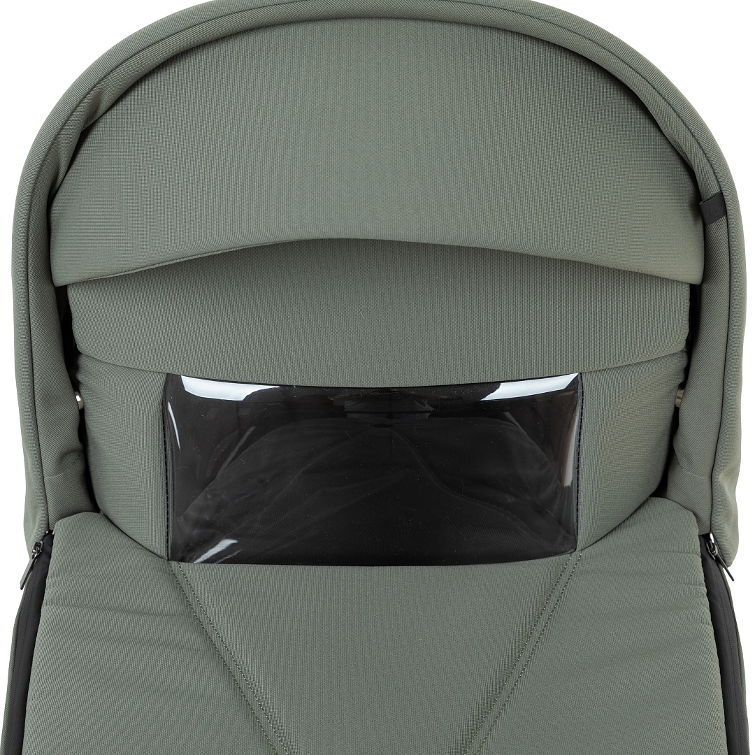 Накидка на люльку имеет дополнительный отворот со смотровым окном, сам отворот полностью закрывает ребенка от непогоды и крепится за счёт магнитов.