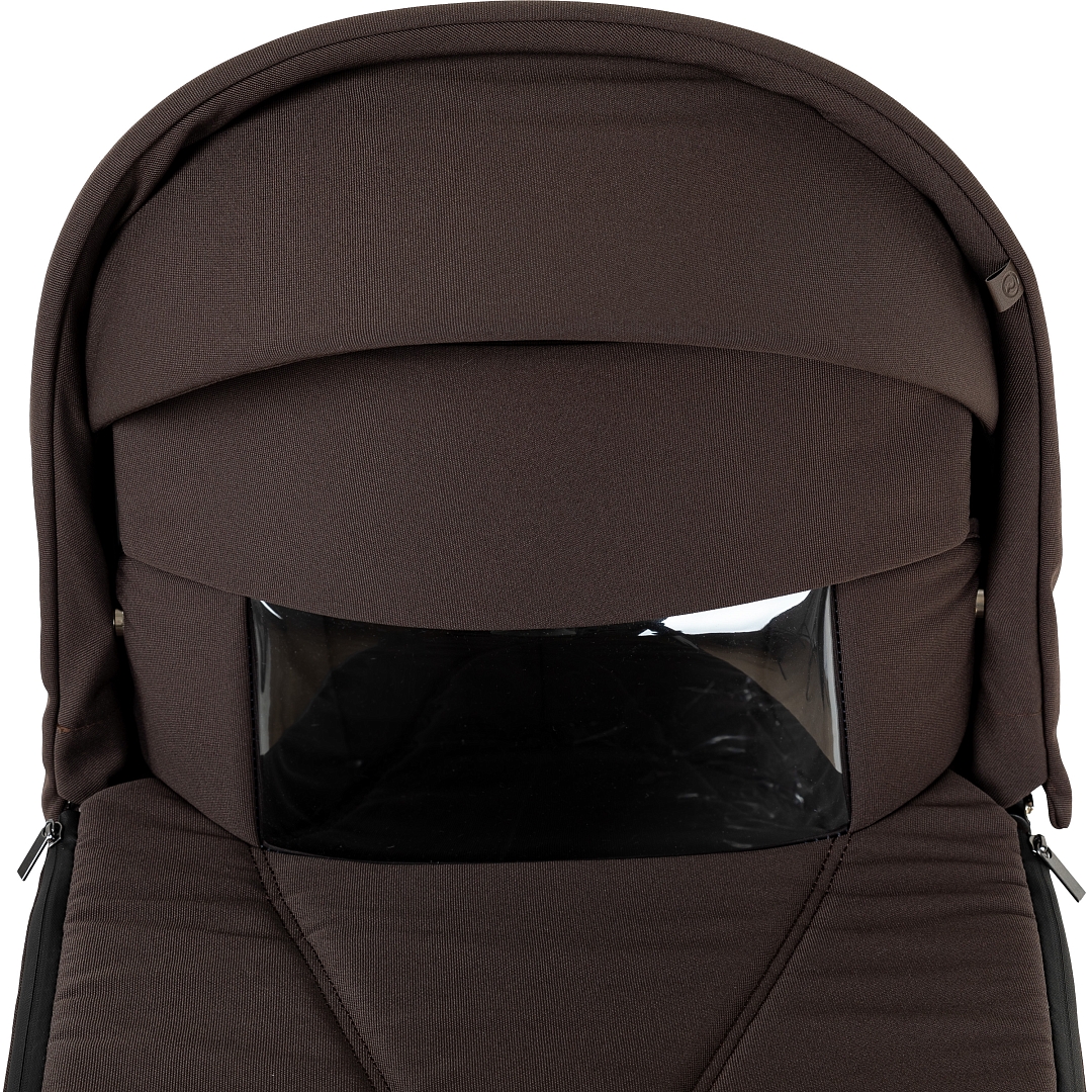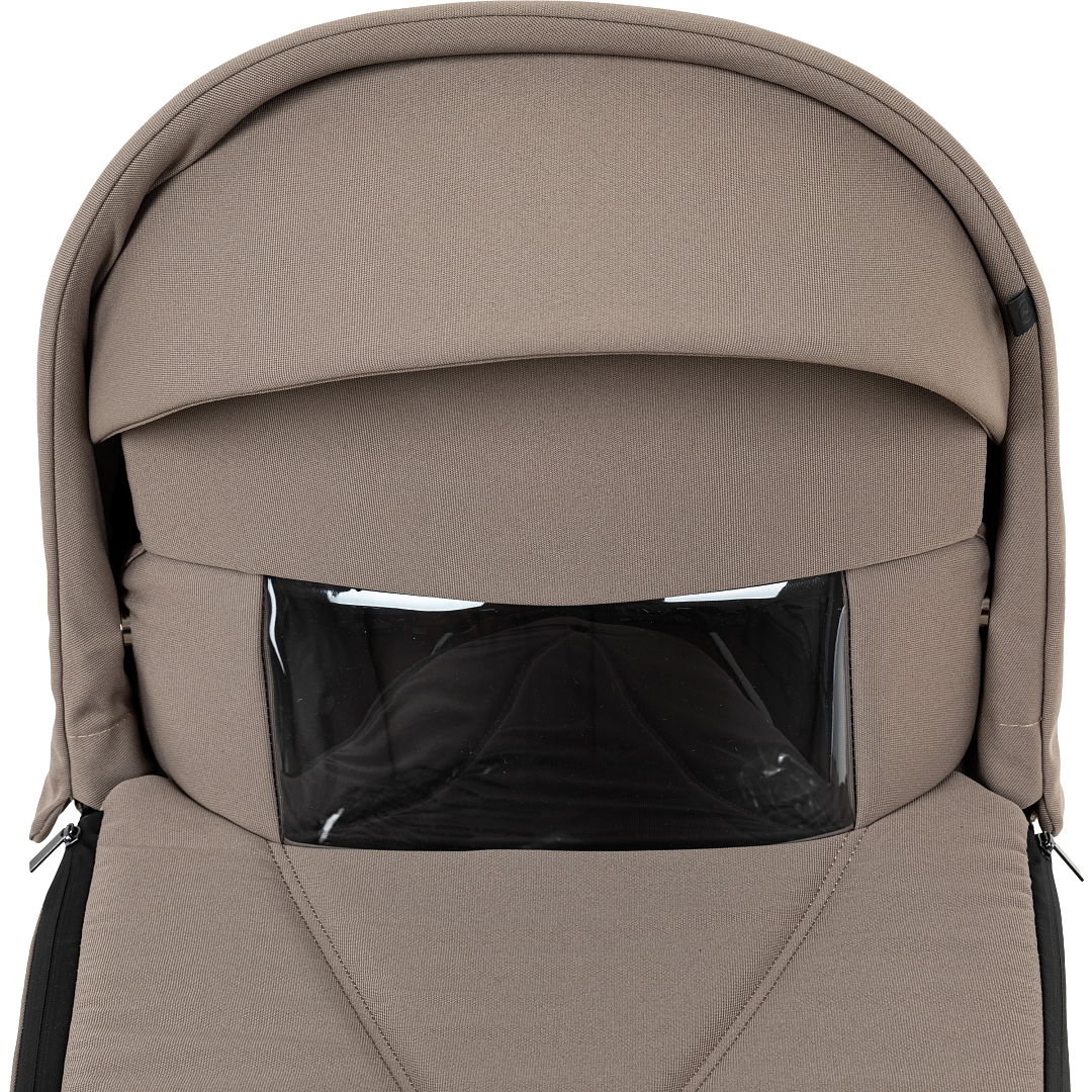 Прогулочный блок имеет отдельный функциональный капор, который можно снять. В капоре есть дополнительный отсек для увеличения покрытия, также есть дополнительный козырёк.