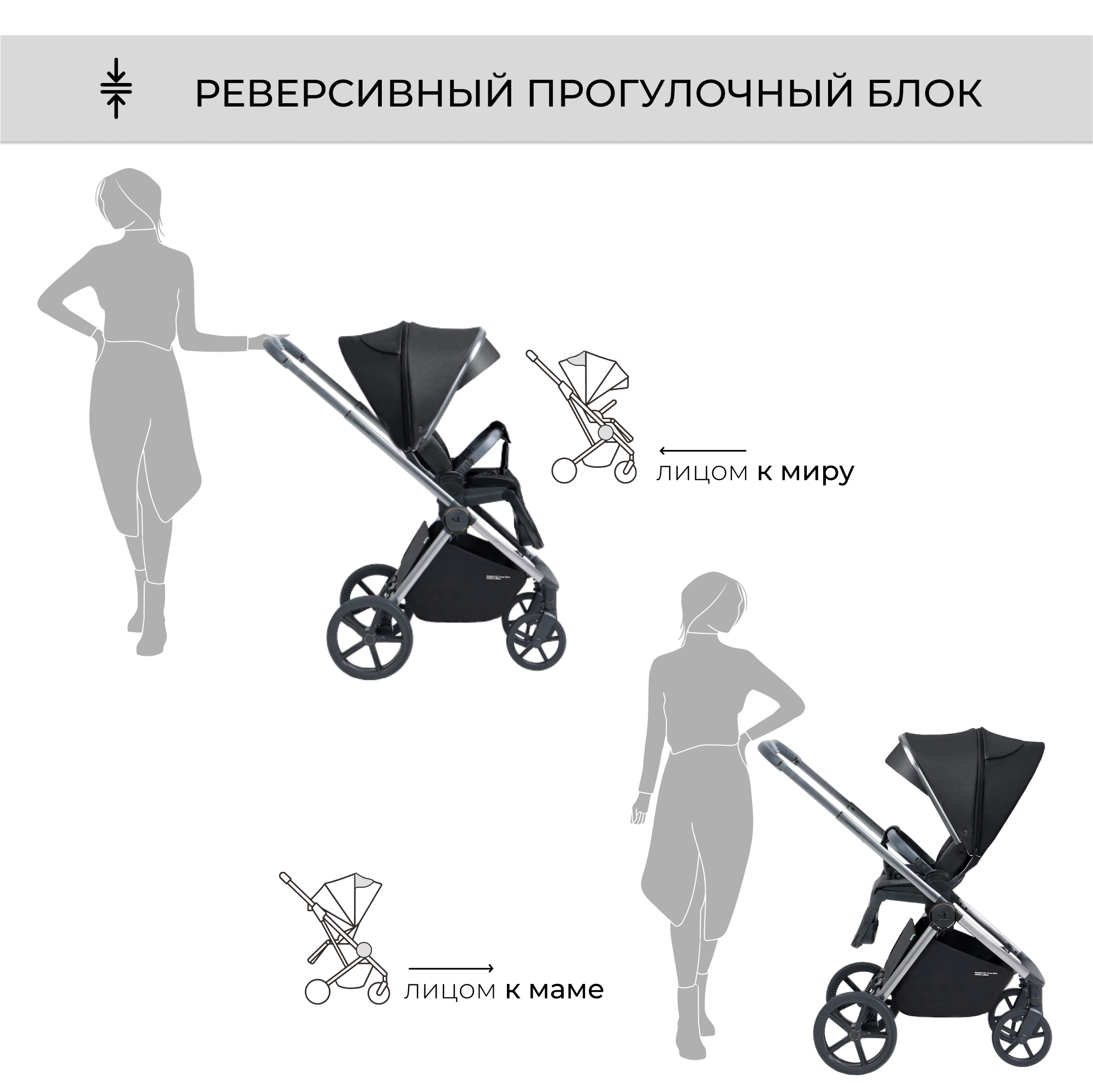 ✔ установить прогулочный блок на шасси также легко, как по ходу движения (лицом к родителю), так и лицом к миру;
