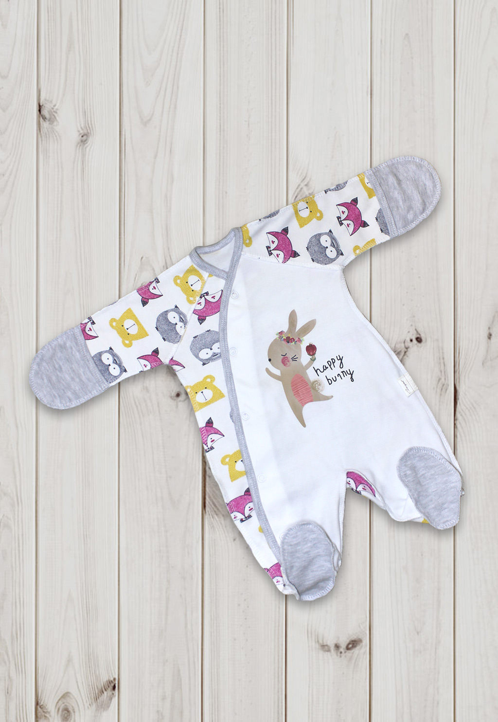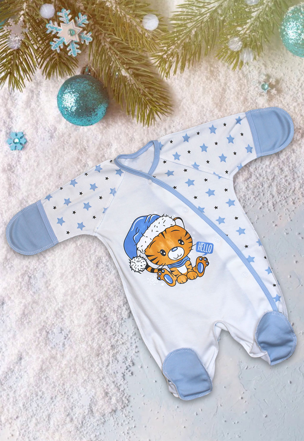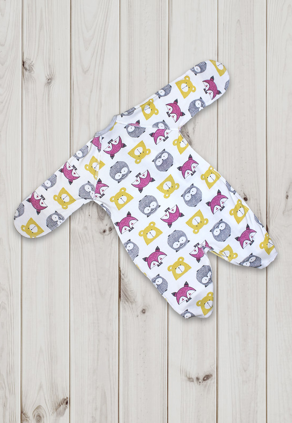 Ручки у комбинезона закрываются-открываются, для большего комфорта малыша изделие выполнено швами наружу. Ножки комбинезона полностью закрыты. Удобная застежка кнопки идет через все изделие наискосок и заканчивается на штанине.