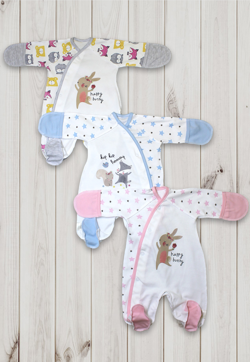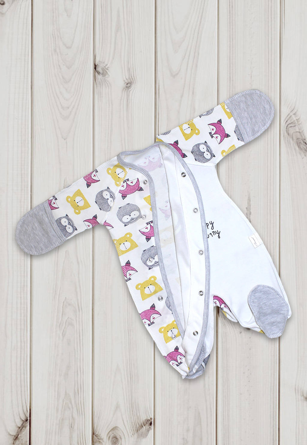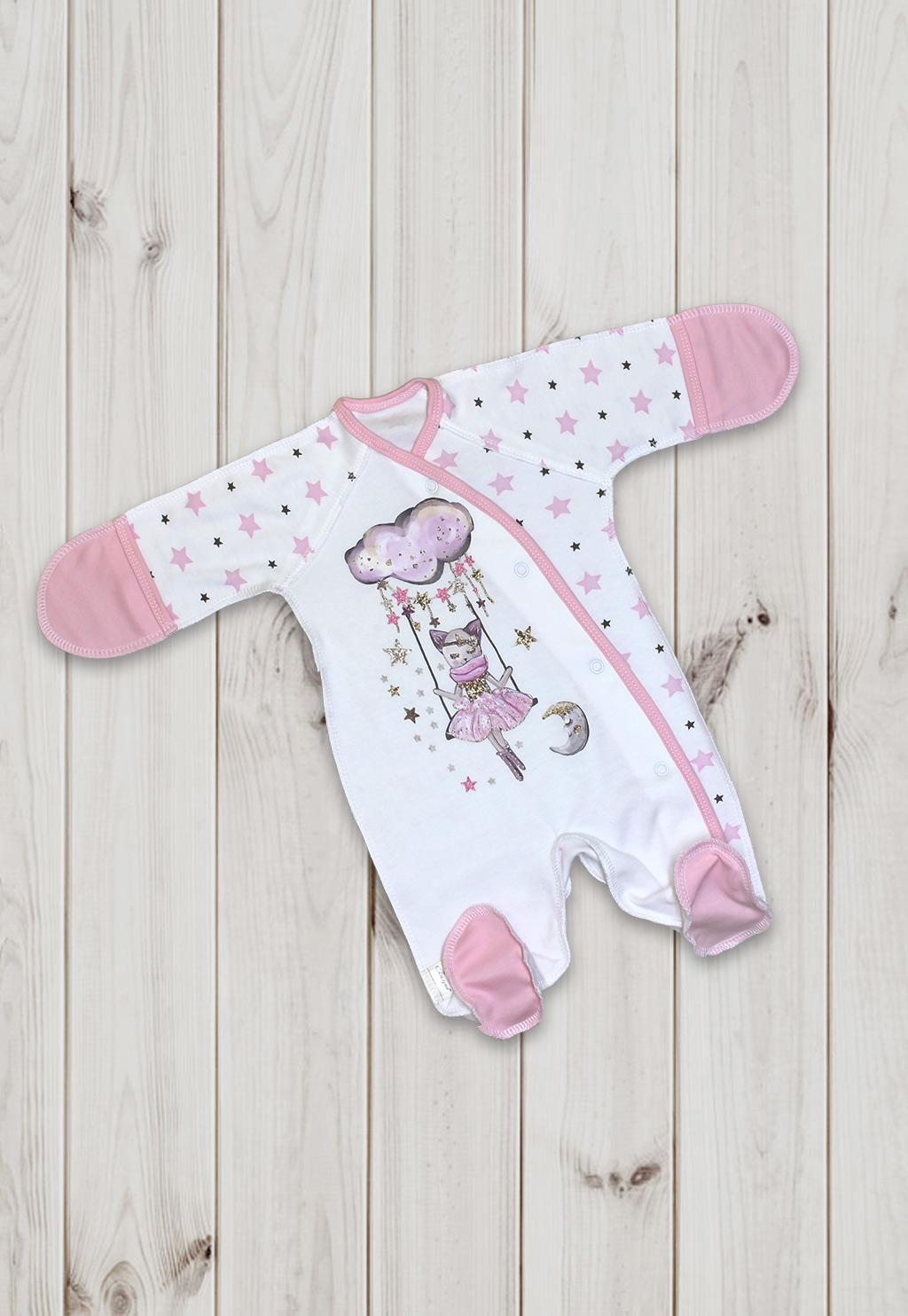 Ручки у комбинезона закрываются-открываются, для большего комфорта малыша изделие выполнено швами наружу. Ножки комбинезона полностью закрыты. Удобная застежка кнопки идет через все изделие наискосок и заканчивается на штанине.