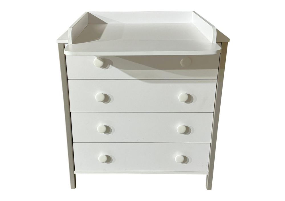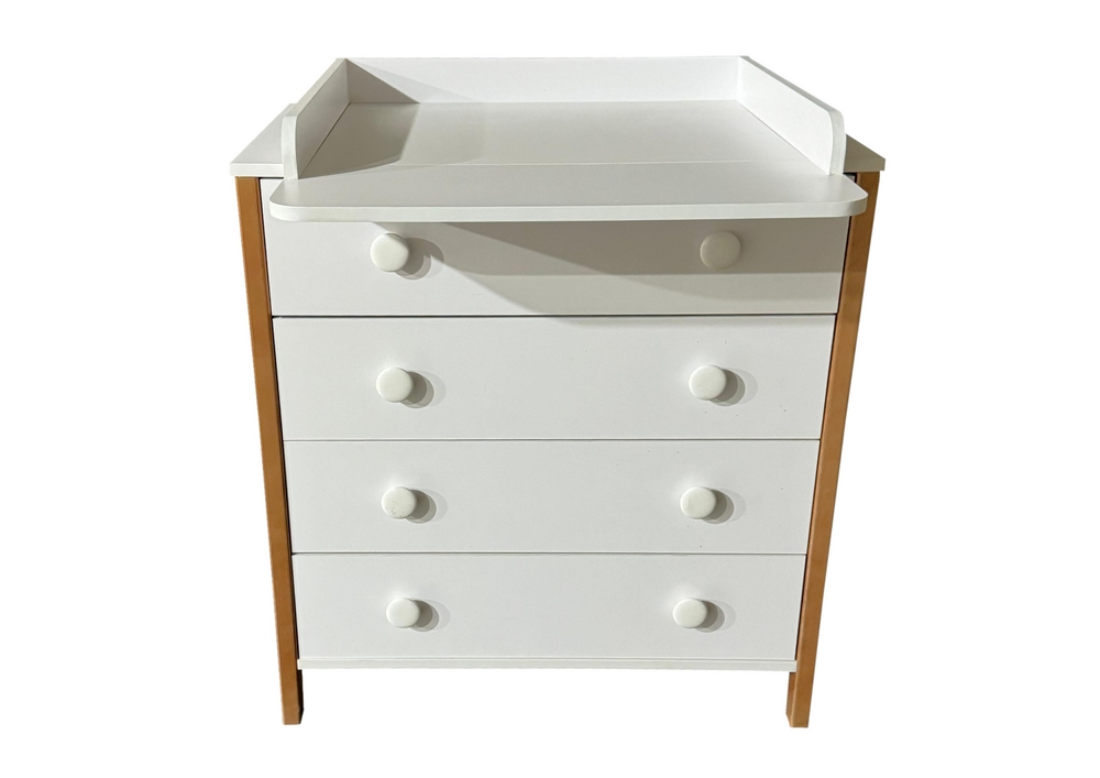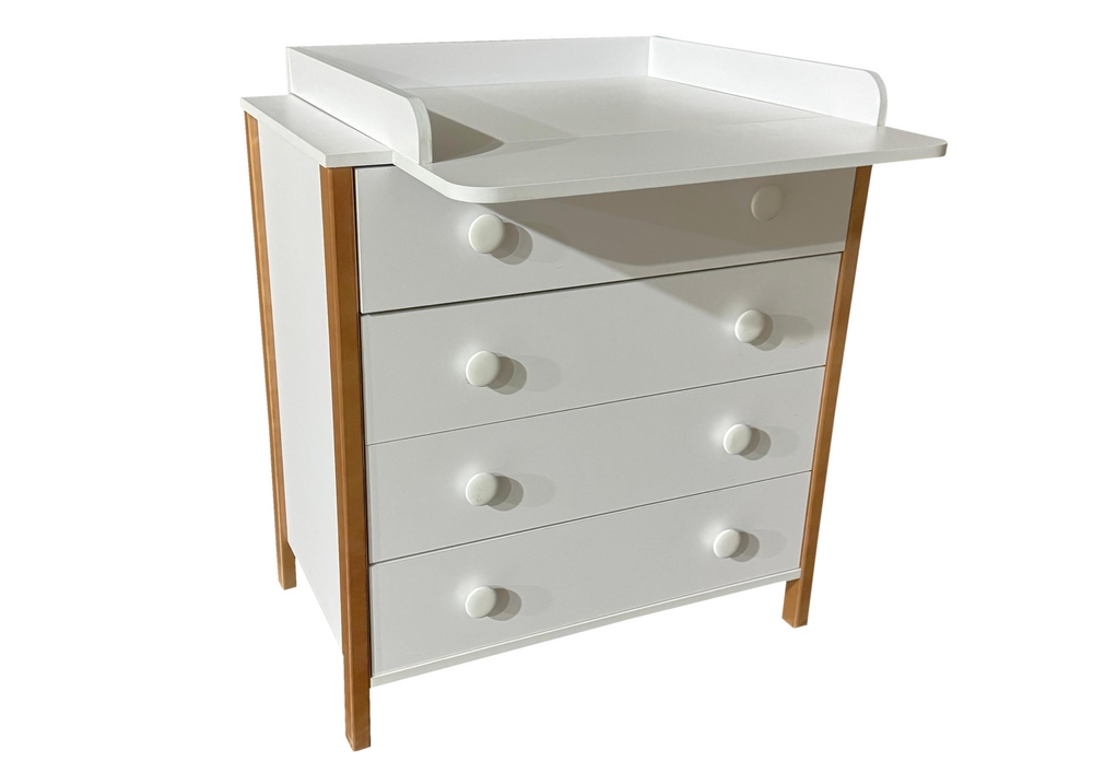 Комод SOLNYSHKO 800/4 от производителя Антел представлен в трех стильных цветовых решениях: белый с отделкой цвета бук, белый с серыми вставками по бокам и чисто белый вариант. Этот комод отличается компактностью и вместительностью, идеально подходит для хранения детских вещей и игрушек.