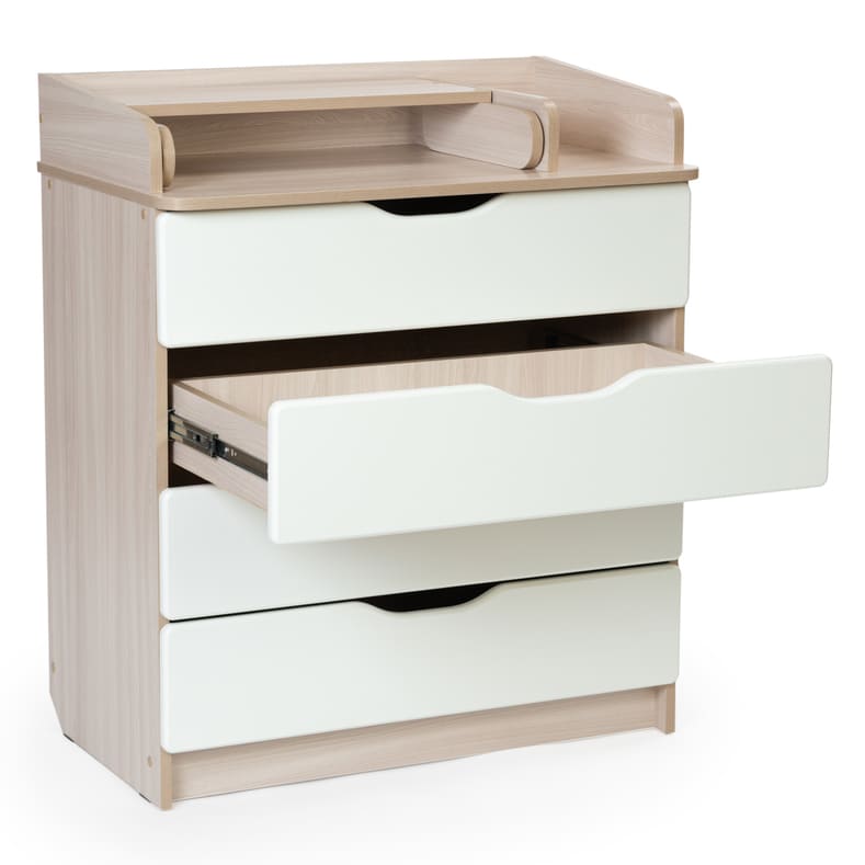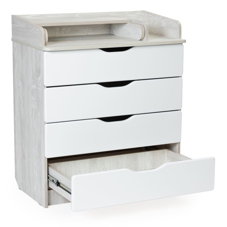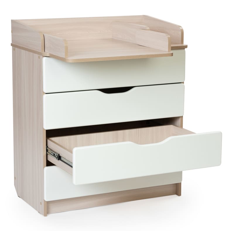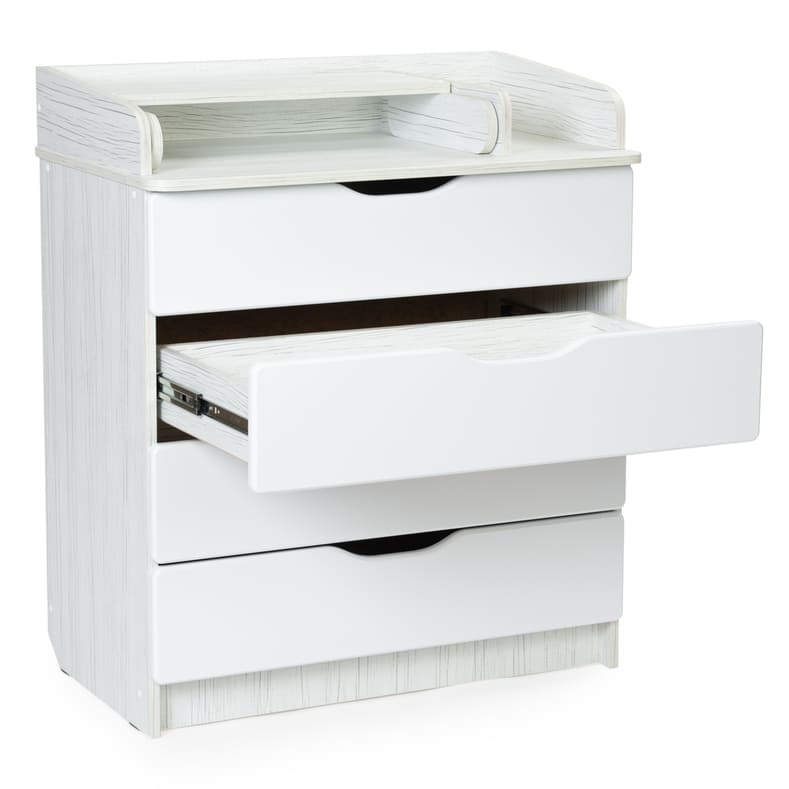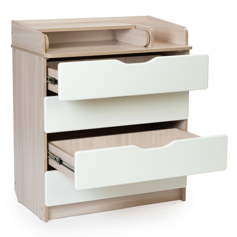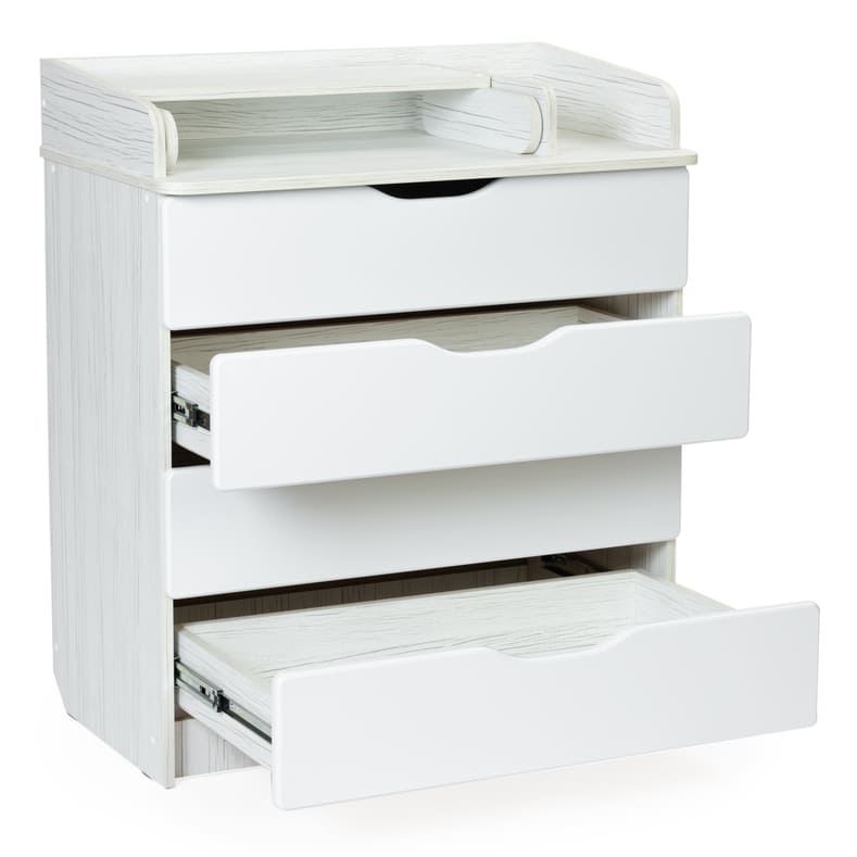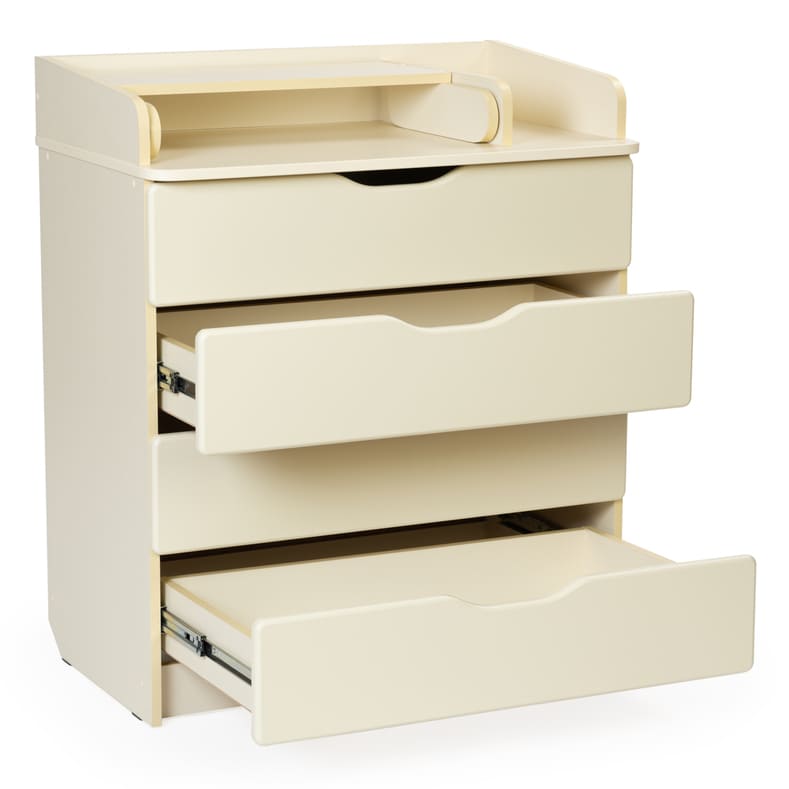 Комод оборудован пеленальным столиком с простым и надежным механизмом раскладывания, 4-е вместительных ящика.