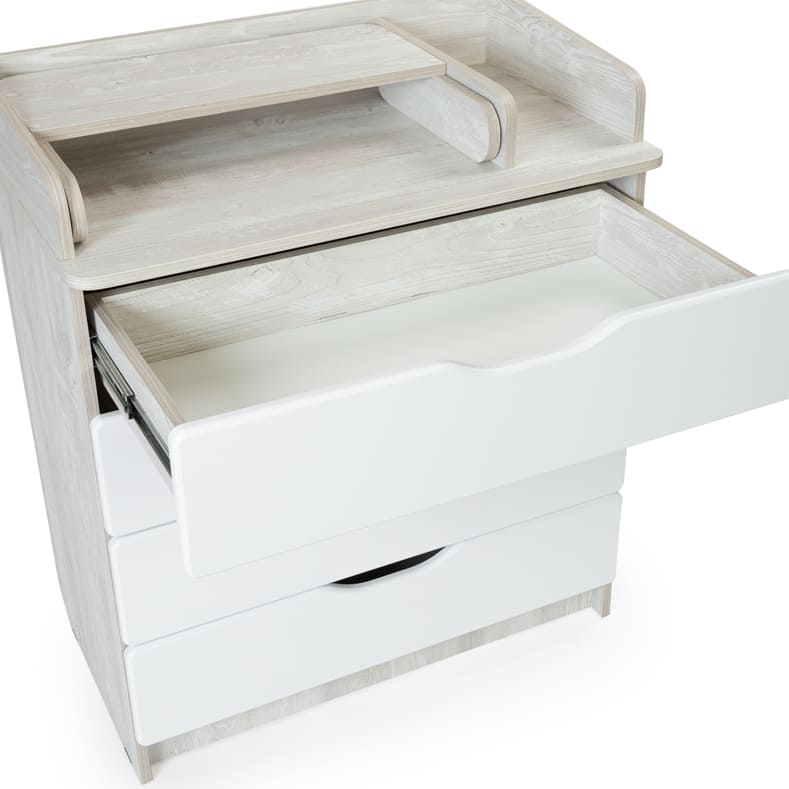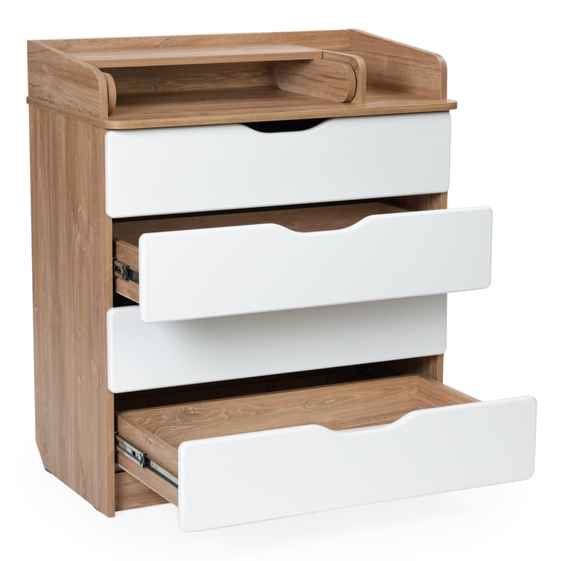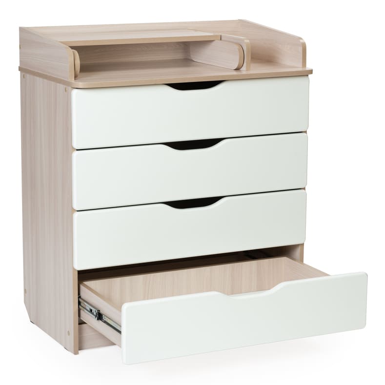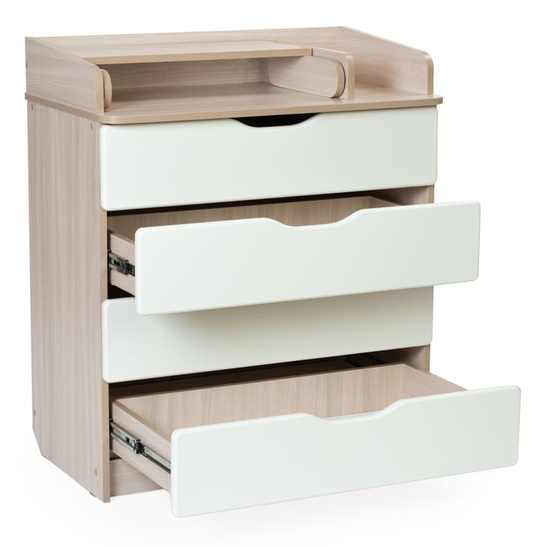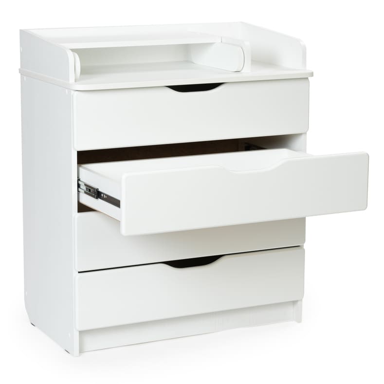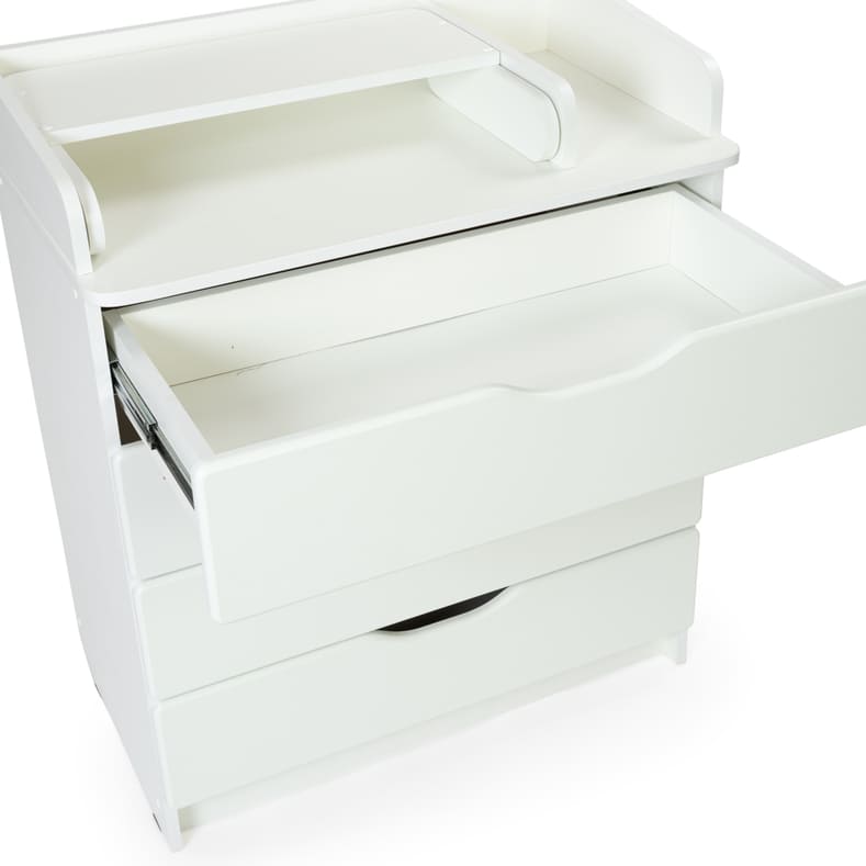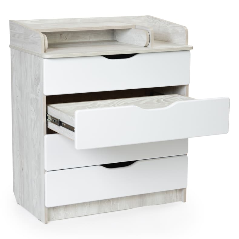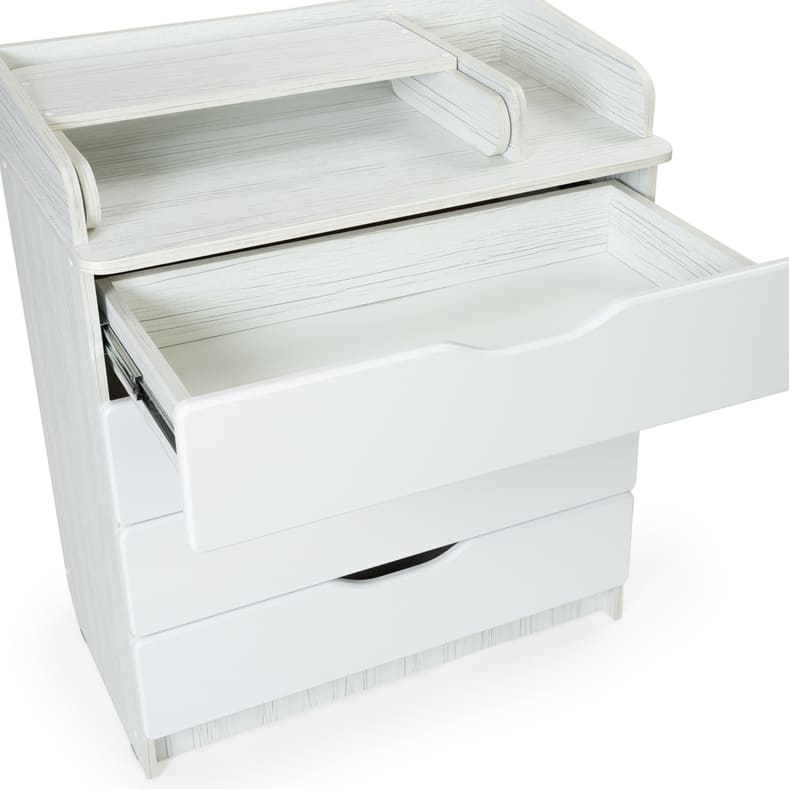 Комод оборудован пеленальным столиком с простым и надежным механизмом раскладывания, 4-е вместительных ящика.