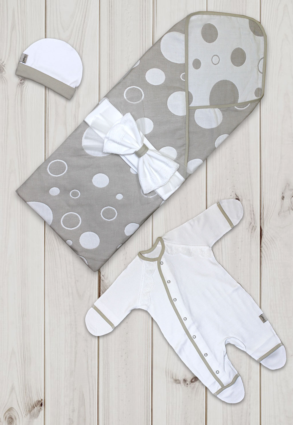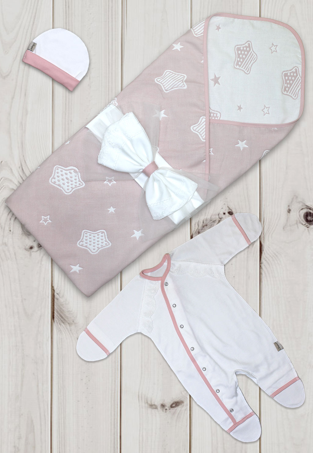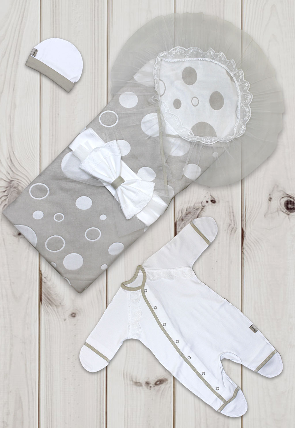 Комплект на выписку Эко-люкс Варианты: лето Комплект из 5 предметов: - плед из 2-х слойного жаккардового хлопка 80х120см (+-5см); - нарядный уголок; - комбинезон с откр.-закрывающимися ручками (р-р 56см); - шапочка (р-р 38см); - бант на липучке Ткань: 100% х/б, кружево-100% п/э