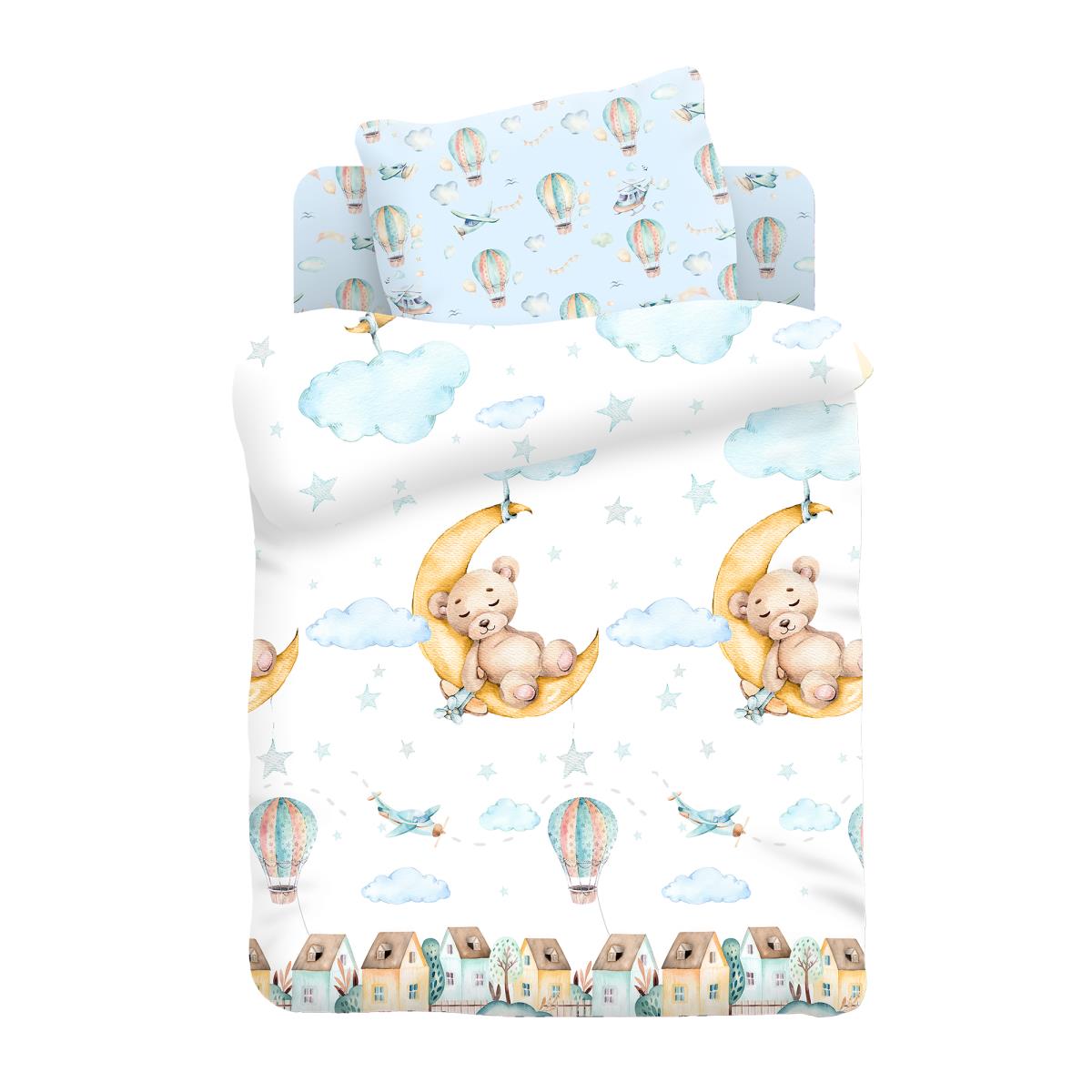 Комплект постельного белья "Лунный мишка" в детскую кроватку. Нежная цветовая гамма сочетает белые и светло-голубые тона. Рисунок из воздушных шаров и плюшевого мишки, спящего на месяце, смотрится мило и очаровывает. Комплект пошит из нежнейшего поплина (хлопок 100%), который прекрасно пропускает воздух и обеспечивает комфорт малыша во время сна.