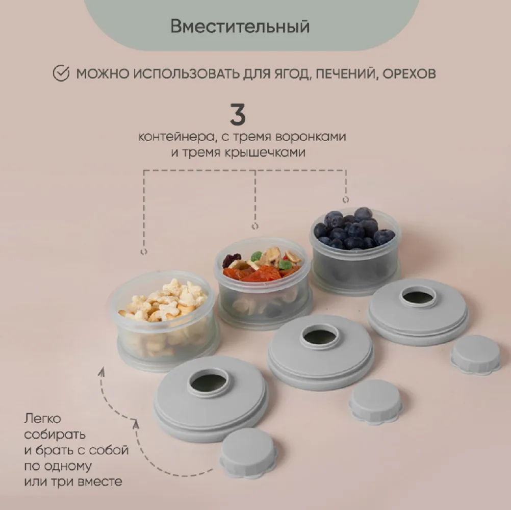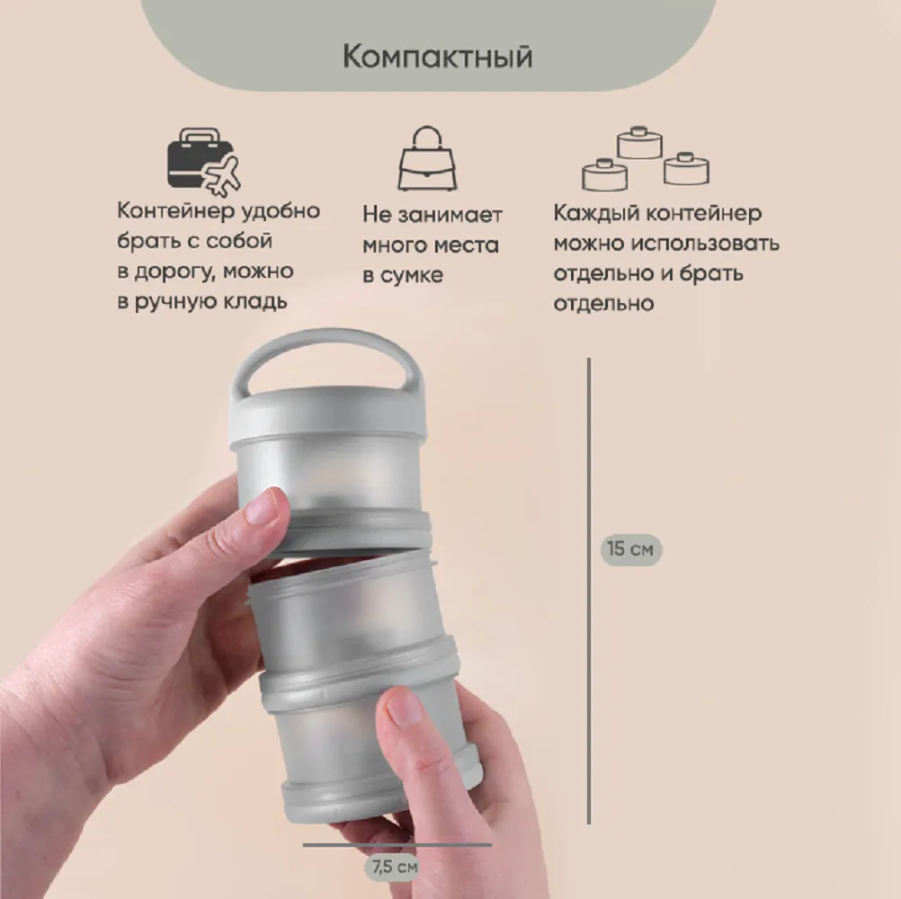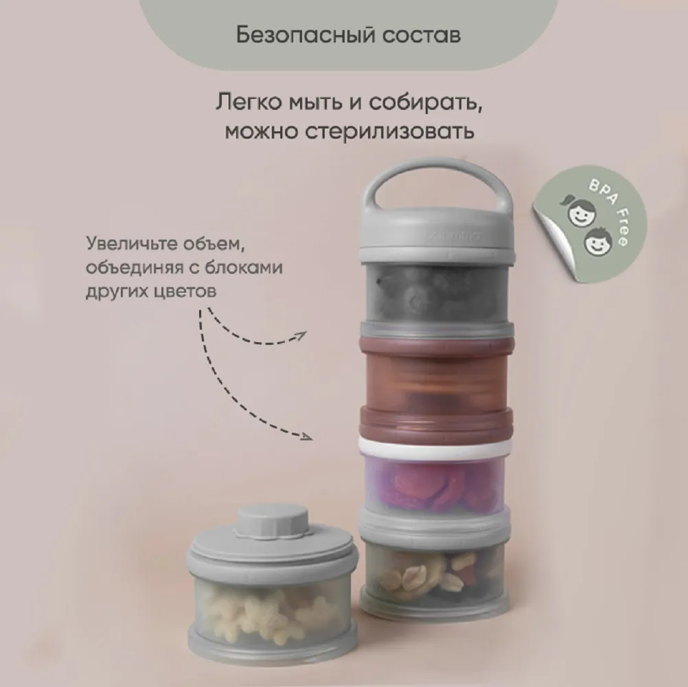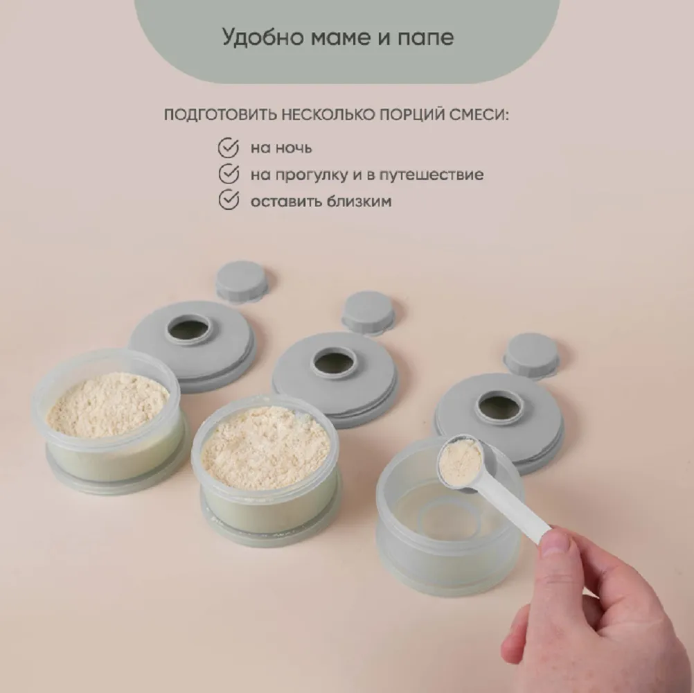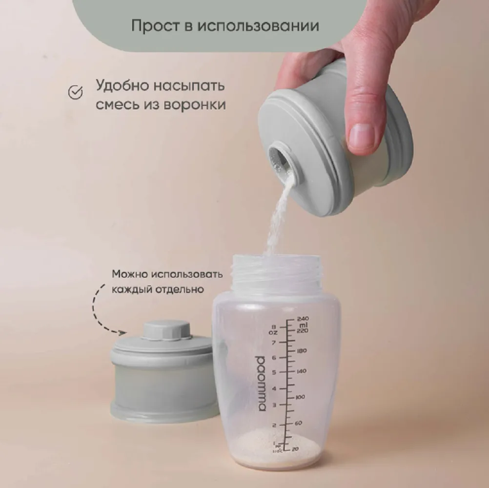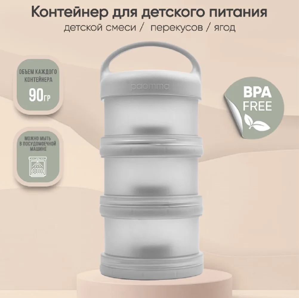 Контейнер для детского питания состоит из 3 отделений. Каждое отделение имеет специальную воронку с крышкой, что позволяет каждое отделение использовать отдельно и легко высыпать смесь в бутылочку. Контейнер удобно брать с собой в дорогу или подготовить несколько порций смеси для кормления на ночь. Широкий носик обеспечивает легкое и полное высыпание смеси из всех трёх отсеков. Крышка надежно закрывается. Каждый отсек контейнера вмещает 3 мерных ложки, 90 гр молочной смеси - отличный дозатор для детской смеси на улице, в гостях, ночью. В посуде для детей может храниться не только молочная смесь , но и пюре детское , творог и различные прикормы, детские сладости и снеки. Пищевой контейнер компактный, можно поместить в любую сумку. коляску.Изготовлен из 100% полипропилена, не содержит бисфенола А, ПВХ и фталатов и не взаимодействует с пищевыми продуктами, что делает его безопасным для использования в детском питании. Все детали контейнера для хранения детского питания можно стерилизовать, разогревать в микроволновой печи и мыть в посудомоечной машине. Благодаря своим компактным размерам и удобной форме контейнер не займет много места в сумочке, а наличие ручки поможет комфортно его переносить. Контейнер для детской смеси эргономичный, имеет надежную силиконовую ручку для крепления или переноса. Благодаря своей форме, контейнер для детского питания устойчив и легко поместится в несессер , сумку или рюкзак и станет поистине незаменимым помощником родителям малыша. Пищевой контейнер для детского питания Paomma представлен в трех цветах: сливочный, розово-коричневый и серо-зеленый. Это идеальный выбор для заботливых родителей, которые хотят сохранить здоровье своих детей и внести свой вклад в охрану окружающей среды. Контейнер под смесь можно легко мыть и использовать снова и снова, что делает его экологически чистым и экономичным в использовании. Контейнер для детского питания обеспечит вашему ребенку питание безопасной пищей.