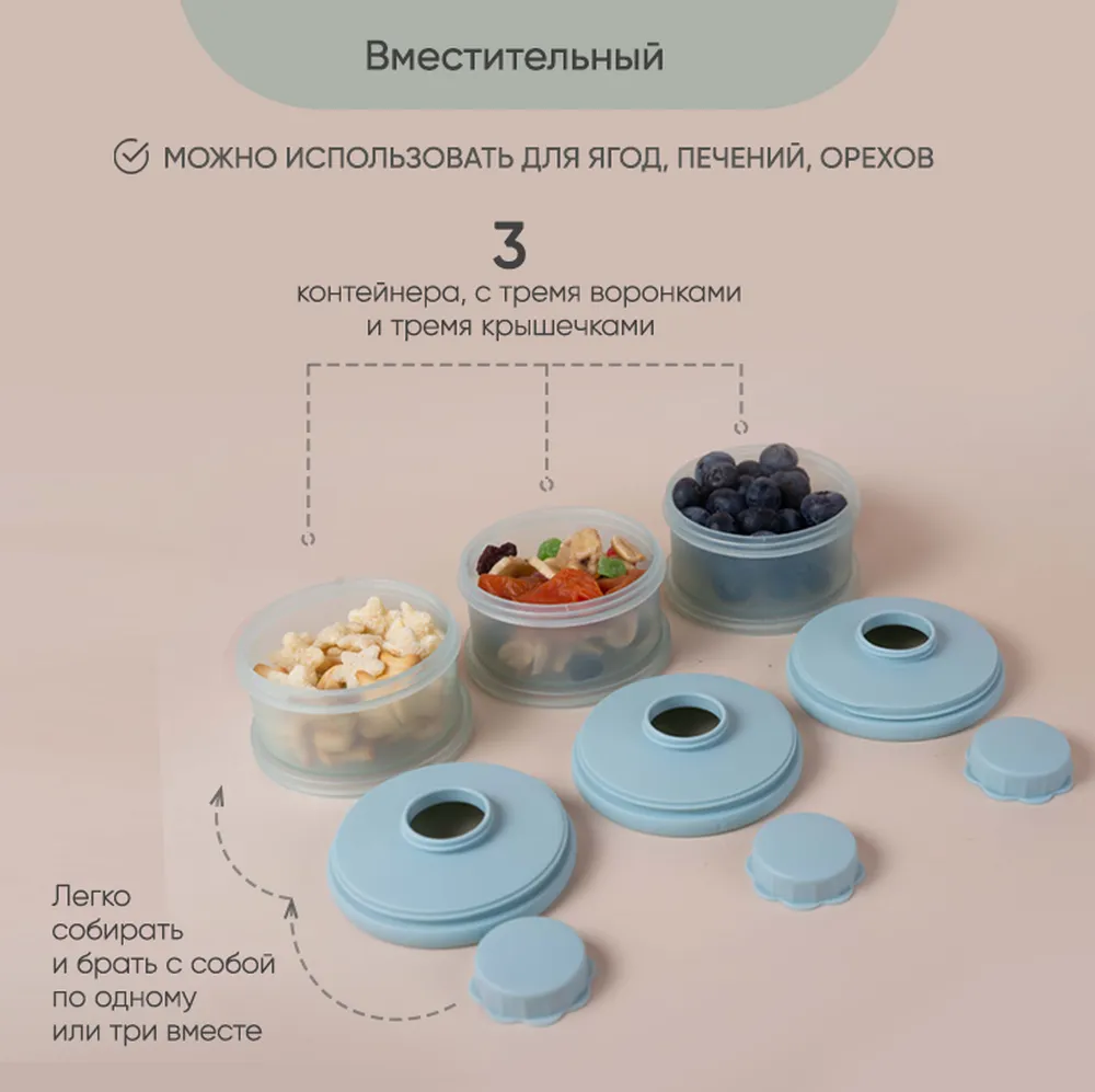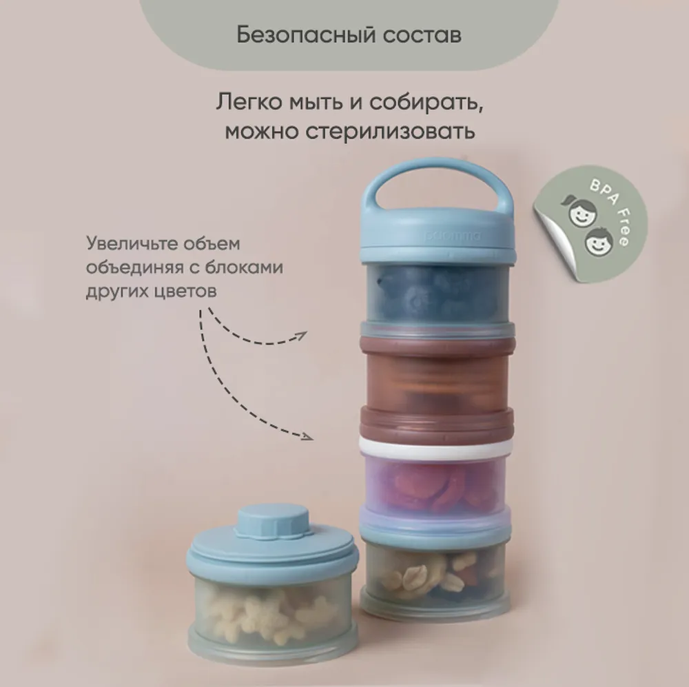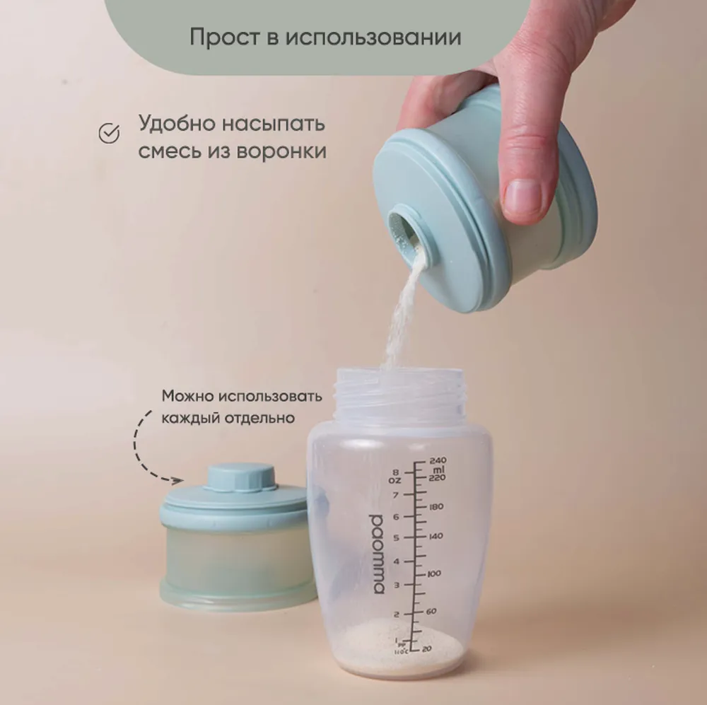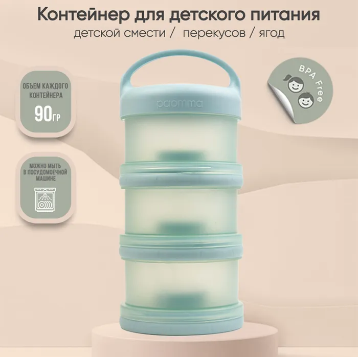 Контейнер для детского питания состоит из 3 отделений. Каждое отделение имеет специальную воронку с крышкой, что позволяет каждое отделение использовать отдельно и легко высыпать смесь в бутылочку. Контейнер удобно брать с собой в дорогу или подготовить несколько порций смеси для кормления на ночь. Широкий носик обеспечивает легкое и полное высыпание смеси из всех трёх отсеков. Крышка надежно закрывается. Каждый отсек контейнера вмещает 3 мерных ложки, 90 гр молочной смеси - отличный дозатор для детской смеси на улице, в гостях, ночью. В посуде для детей может храниться не только молочная смесь , но и пюре детское , творог и различные прикормы, детские сладости и снеки. Пищевой контейнер компактный, можно поместить в любую сумку. коляску.Изготовлен из 100% полипропилена, не содержит бисфенола А, ПВХ и фталатов и не взаимодействует с пищевыми продуктами, что делает его безопасным для использования в детском питании. Все детали контейнера для хранения детского питания можно стерилизовать, разогревать в микроволновой печи и мыть в посудомоечной машине. Благодаря своим компактным размерам и удобной форме контейнер не займет много места в сумочке, а наличие ручки поможет комфортно его переносить. Контейнер для детской смеси эргономичный, имеет надежную силиконовую ручку для крепления или переноса. Благодаря своей форме, контейнер для детского питания устойчив и легко поместится в несессер , сумку или рюкзак и станет поистине незаменимым помощником родителям малыша. Пищевой контейнер для детского питания Paomma представлен в трех цветах: сливочный, розово-коричневый и серо-зеленый. Это идеальный выбор для заботливых родителей, которые хотят сохранить здоровье своих детей и внести свой вклад в охрану окружающей среды. Контейнер под смесь можно легко мыть и использовать снова и снова, что делает его экологически чистым и экономичным в использовании. Контейнер для детского питания обеспечит вашему ребенку питание безопасной пищей.
