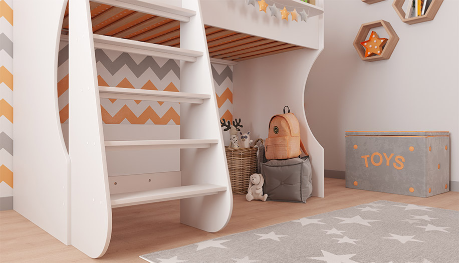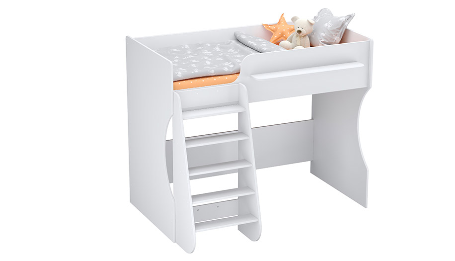Продуманный дизайн позволяет организовать комфортное место для сна и оптимально использовать высоту помещения. Наличие полочки дает возможность дополнить спальный уголок любыми аксессуарами и игрушками. Ребенок самостоятельно может украшать и заполнять полочку у спального места рамками для фотографий, игрушками и всеми необходимыми вещами.