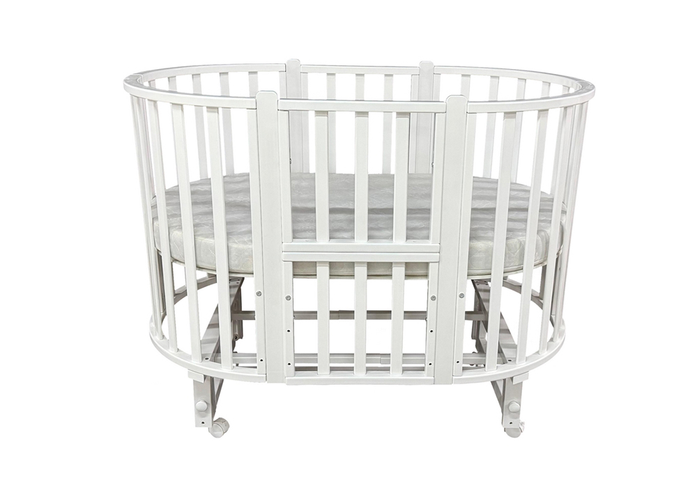 В овальной кроватке верхнюю часть решетки можно снять и тем самым обеспечить свободный доступ к ребенку.