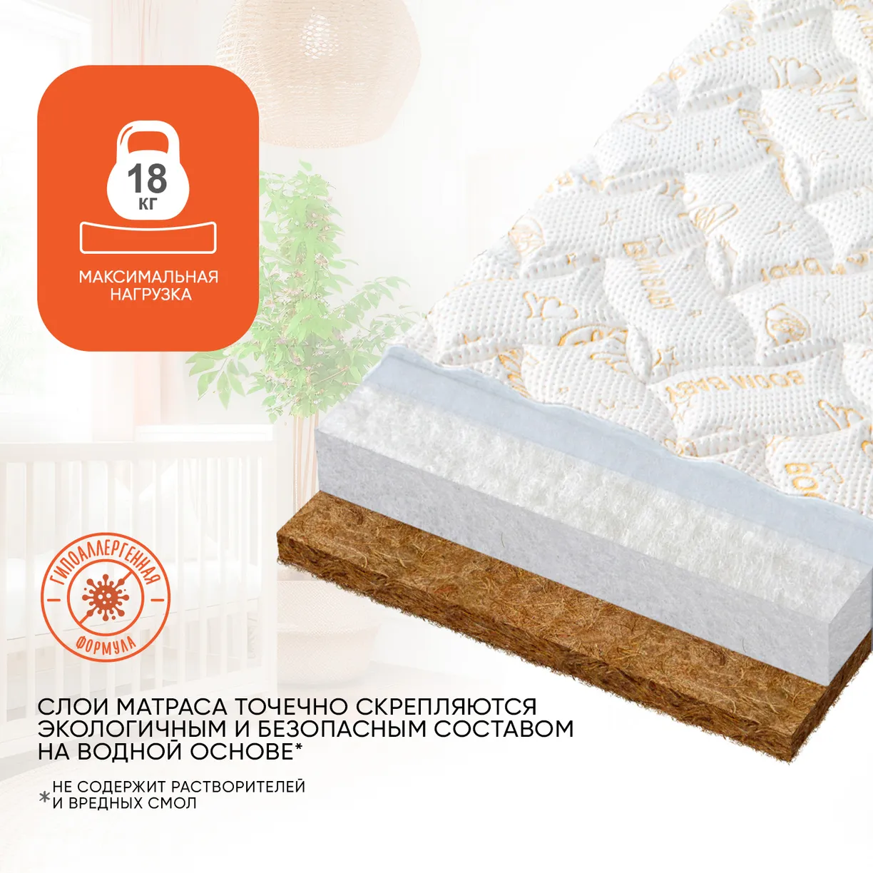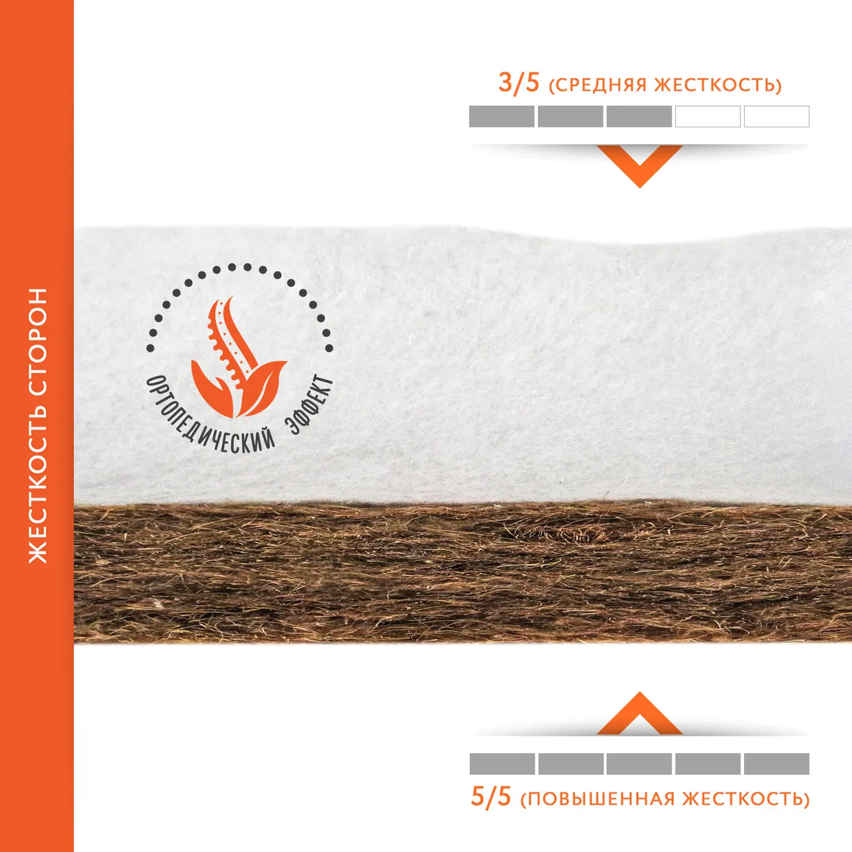 Кокосовая койра относится к линейке оптимально-жестких, дышащих наполнителей высокой упругости, правильной жесткости и с высоким показателем сопротивления сжатию. Усиленный слой кокосовой койры с одной стороны матраса в данной модели обеспечивает разницу в жесткости сторон матраса, давая возможность родителям выбрать оптимальную.