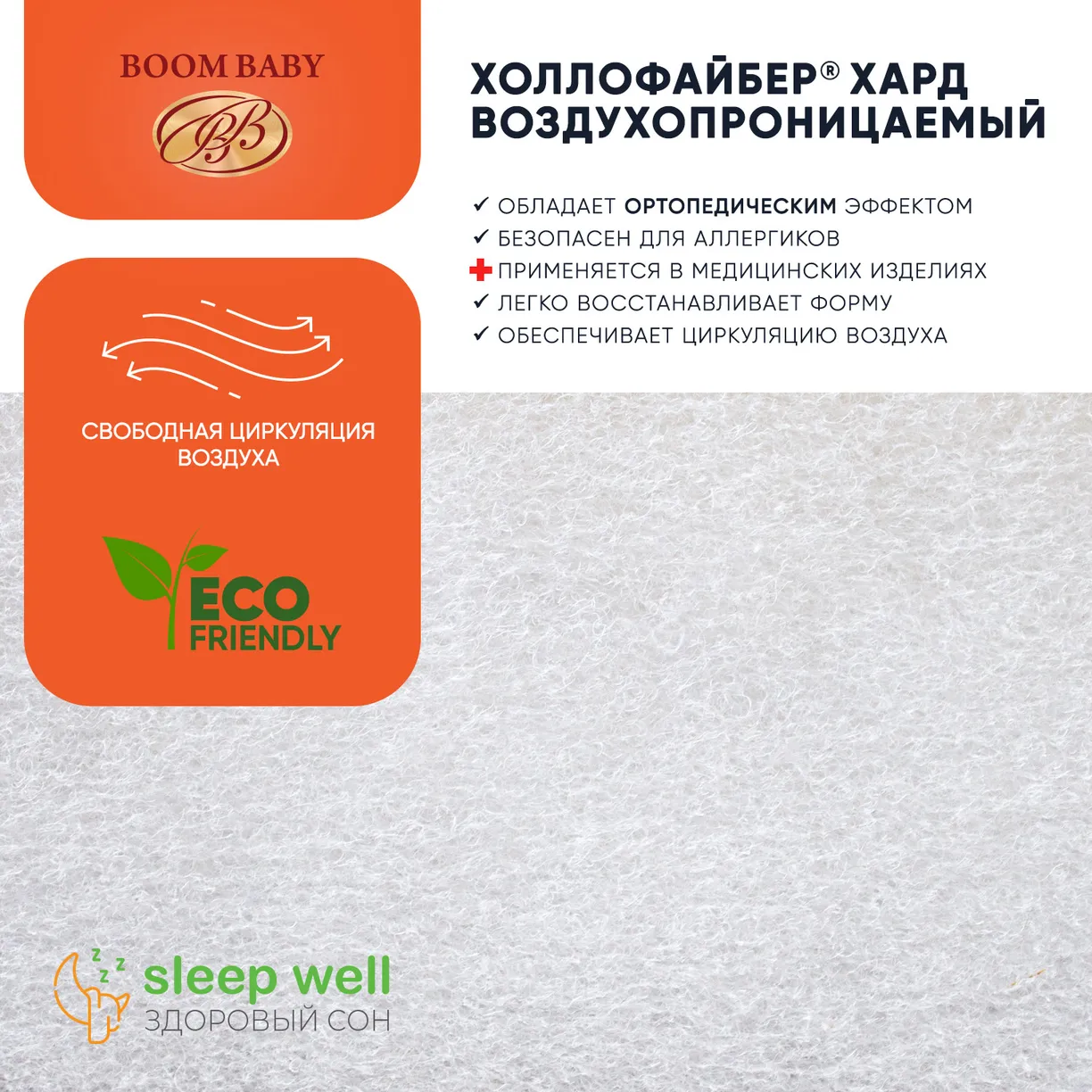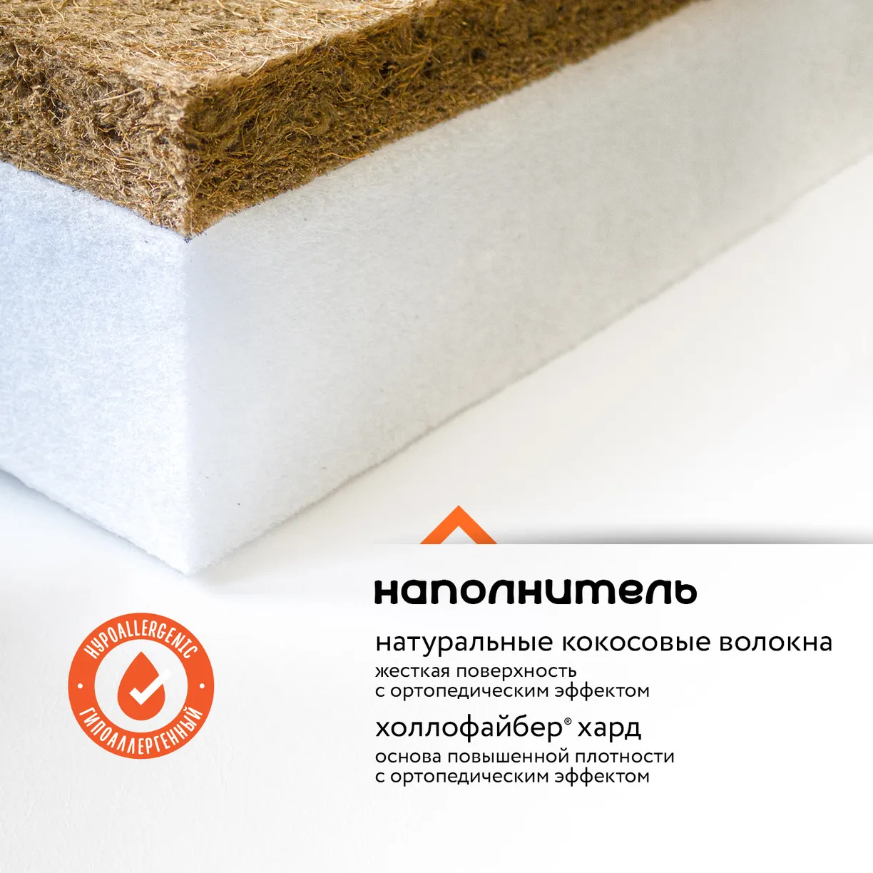 Холлофайбер хард — экологичный, упругий, дышащий, гипоаллергенный наполнитель с уникальной структурой волокон, имитирующей работу пружин. Спиральная форма волокон плиты Холлофайбера обеспечивает идеальную, устойчивую к сминанию и деформации поверхность с равномерным распределением давления, что благоприятно сказывается на формировании позвоночника и мышц ребенка. Помимо перечисленных преимуществ этого универсального материала, он также обеспечивает прекрасную внутреннюю циркуляцию воздуха в матрасе и непригоден для паразитов и вредных бактерий. Холлофайбер хард не вызывает аллергических реакций, не гниет, не отсыревает и не сбивается в комки, подходит для всесезонного использования.