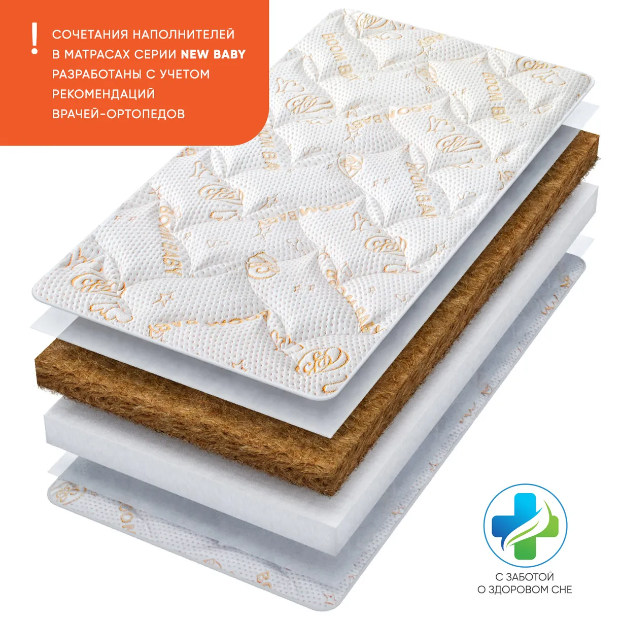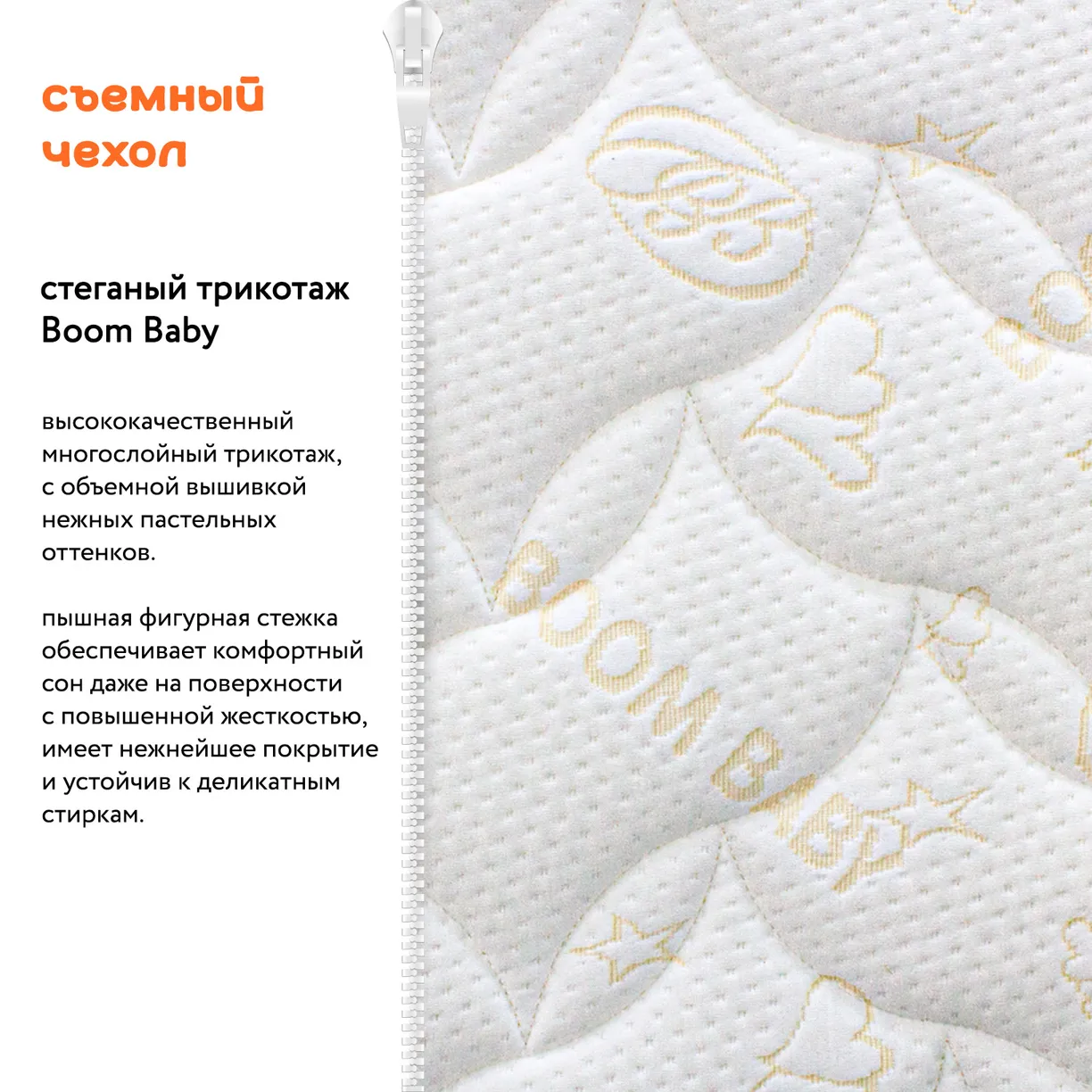 Матрас дополнен съемным чехлом из брендированного многослойного трикотажа «Boom Baby», который является отличительной чертой серии NewBaby. Этот чехол простеган на трипл-синтепоне и обеспечивает максимальный комфорт даже на кокосовой стороне. Молния на три стороны, позволяет легко и быстро снять чехол в случае необходимости.