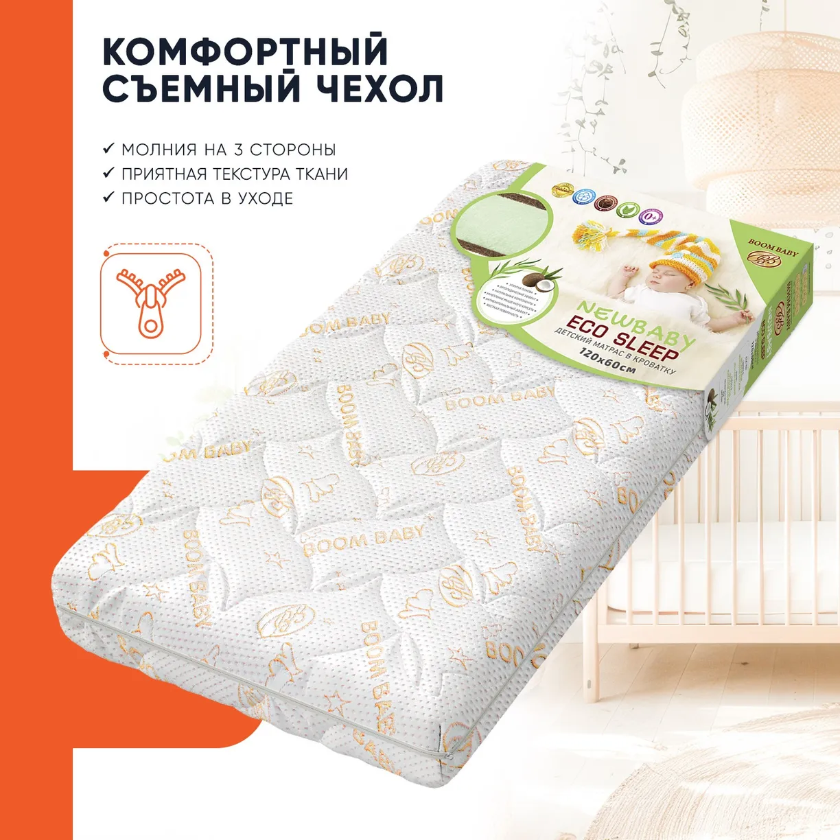 Для повышения комфорта сна в комплект к матрасу входит съемный чехол усиленной объёмной стёжки. Выполненный из многослойного фирменного трикотажа «Boom Baby», он очень нежный и мягкий на ощупь, приятного цвета топленого молока. При необходимости его можно быстро и легко снять с помощью потайной молнии, которая проходит по трем сторонам изделия. Трикотаж не боится деликатной стирки, не усаживается в размере и не теряет своей мягкости.