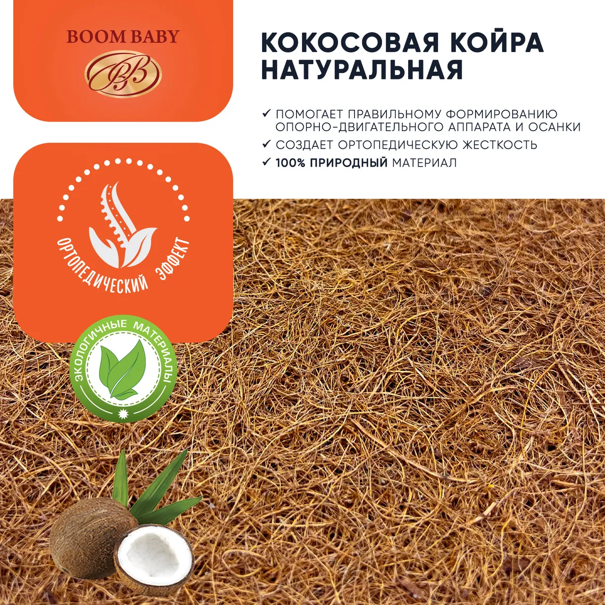 Жесткая поверхность матраса из кокосовых волокон предназначена для сна новорожденного младенца, ведь кокос признан специалистами-ортопедами как один из самых оптимально-жестких наполнителей. Кокосовая койра образует упругий, и в то же время очень эластичный материал, с прекрасной воздухопроницаемостью, а слой кокосовых волокон с двух сторон значительно повышает ортопедические свойства матраса.