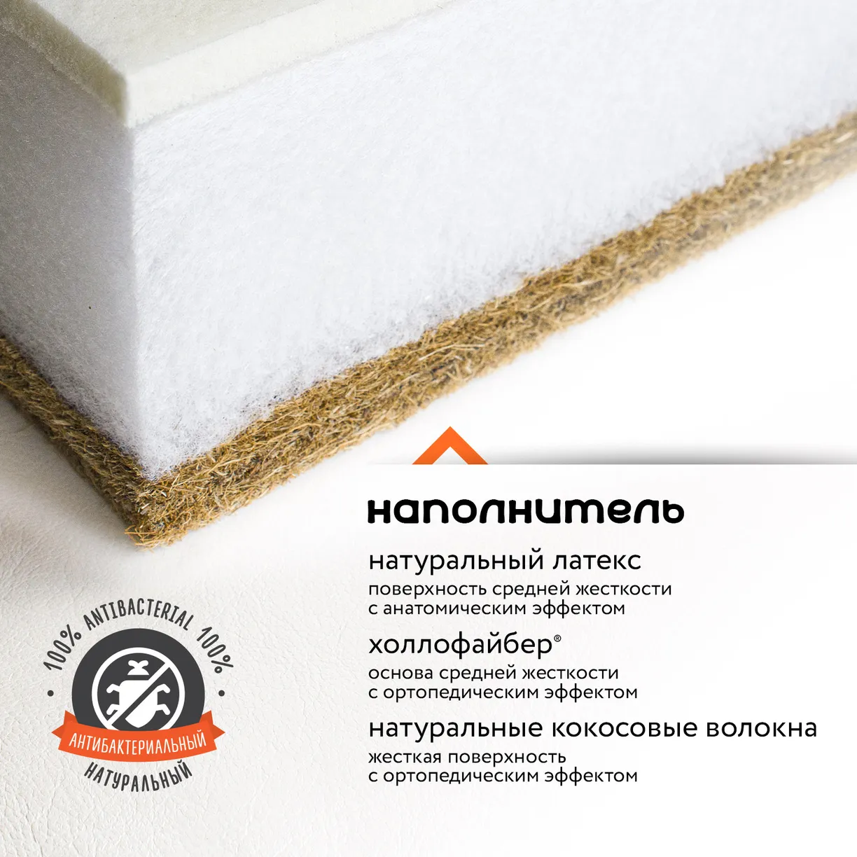 Жесткая сторона матраса с двойным слоем кокосовых волокон предназначена для сна новорожденного младенца. Кокосовая койра давно признана специалистами-ортопедами как один из самых оптимально-жестких наполнителей, необходимых малышу буквально с первых дней жизни для формирования мышечного корсета и позвоночника, и, следовательно, красивой и здоровой осанки в дальнейшем. Кокосовая койра, скрепленная натуральным латексом, образует упругий, и в то же время очень эластичный материал, с прекрасной воздухопроходимостью, а двойной слой кокосовых волокон значительно повышает ортопедические свойства матраса.
