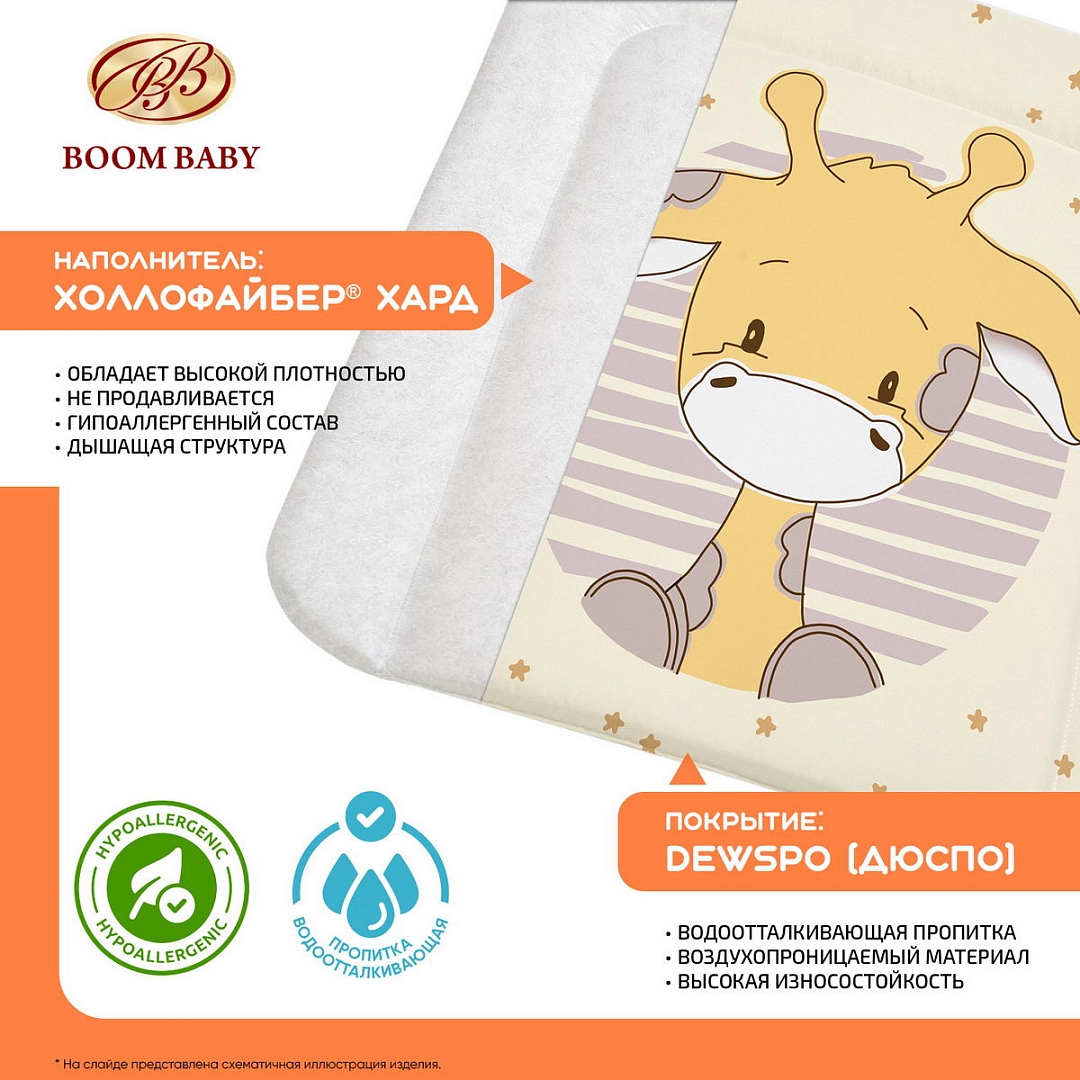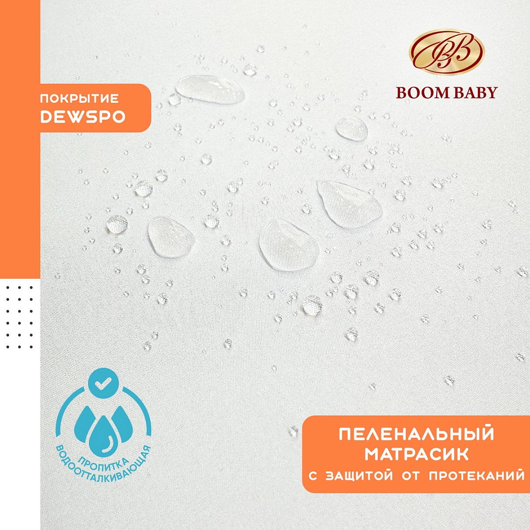 Покрытие матрасика выполнено из высококачественного материала «Dewspo», нежного и приятного на ощупь, с водоотталкивающей пропиткой. В отличии от клеенки этот материал «дышит», что обеспечивает необходимую вентиляцию наполнителя, а красивый рисунок добавит эстетического удовольствия маме и малышу.