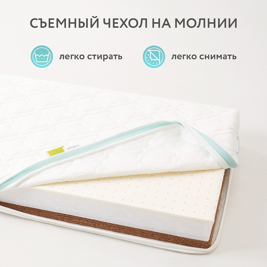 Съемный чехол упростит уход за матрасом. Молния с трех сторон чехла — так его гораздо легче снимать (например, для стирки) и надевать обратно. При этом молния в целях безопасности вшита особым образом, так, чтобы ребенок не смог случайно задеть ее ручкой или ножкой.