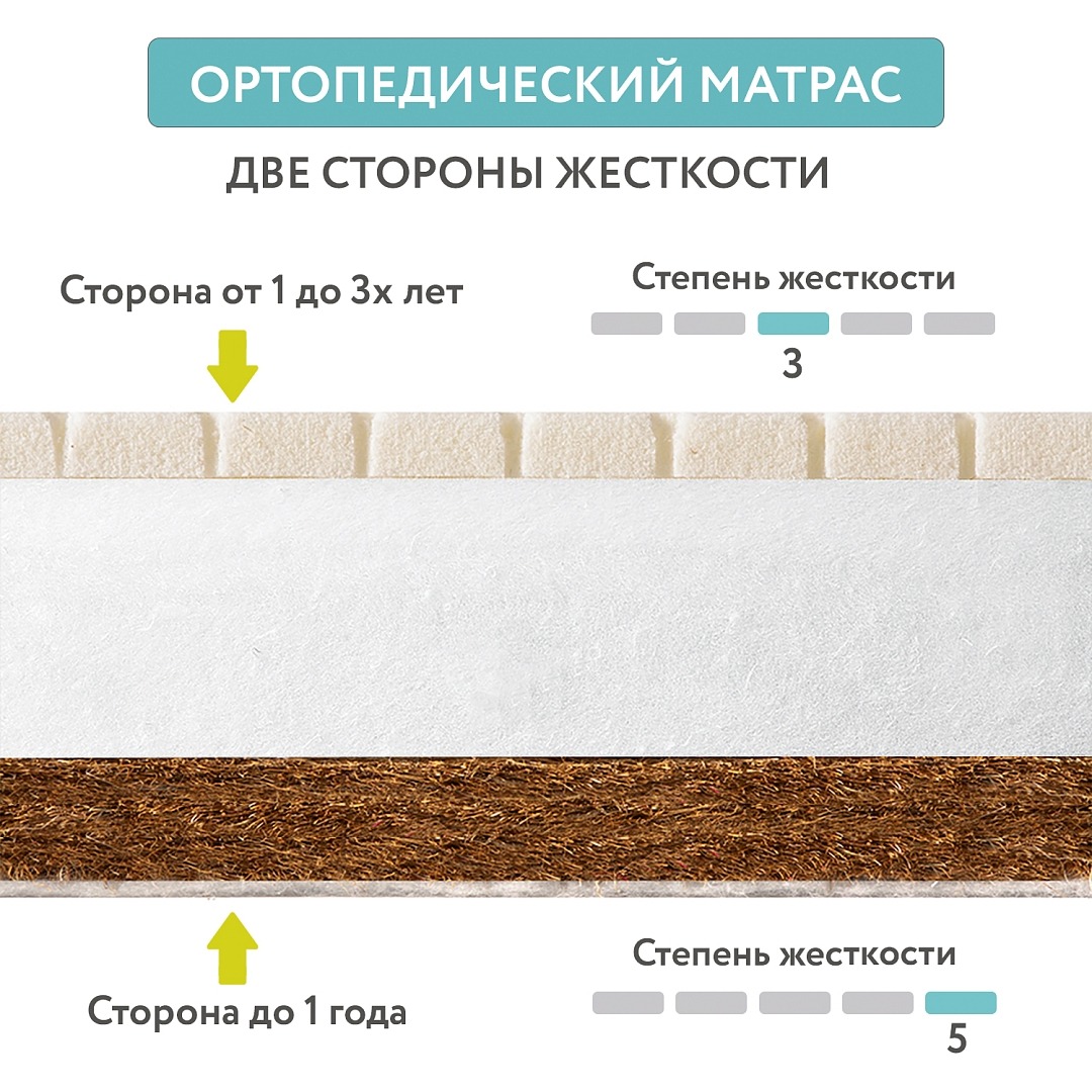 Две стороны разной жесткости: жесткая сторона для сна в первые месяцы (5 из 5) и более эластичная для подрастающего малыша (4 из 5). Результат — спокойный, комфортный сон и правильная осанка.