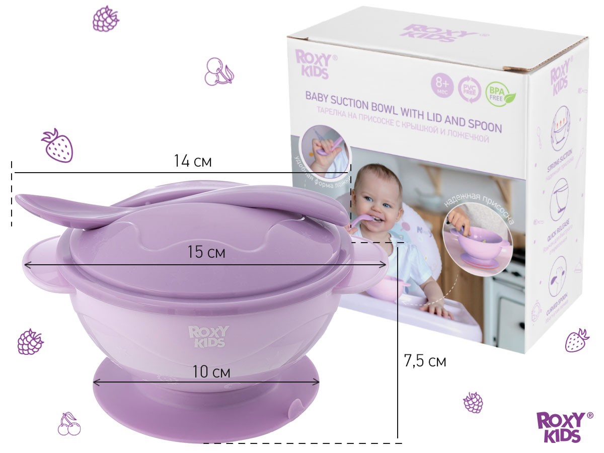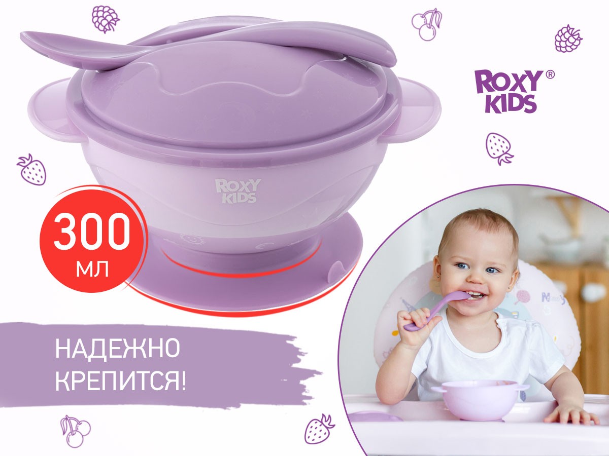 Детская тарелочка на присоске ROXY-KIDS поможет приучить ребенка к самостоятельному приему пищи и сделает процесс кормления легким и приятным! Тарелка легко крепится к столу или стульчику для кормления и останется на месте, даже если малыш совершит неосторожное движение рукой. Специальный язычок помогает легко открепить изделие от поверхности. Плоская и изогнутая форма ложки идеально подходит для малыша, который только учится пользоваться столовыми приборами. Крышка плотно закрывается для транспортировки, а ложка удобно крепится на крышку и не теряется. Большой диаметр и глубина тарелочки подходят для жидких каш и пюре. Изделие выполнено из высококачественного пищевого материала, имеет закругленные края и абсолютно безопасно для малыша!