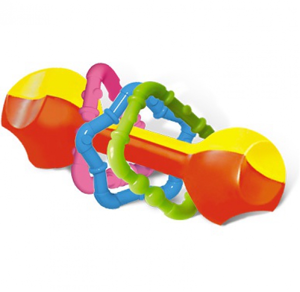 Игрушку в форме гантельки малышу не под силу взять в рот, поэтому она идеальна для его игр. Как бы ребенок не повернул погремушку, она будет всегда ему интересна. Оба конца гантельки снабжены наполнителем из мелких шуршащих шариков, за которыми ребенок может наблюдать. Старших малышей увлекут разъемные элементы на рукоятке погремушки.