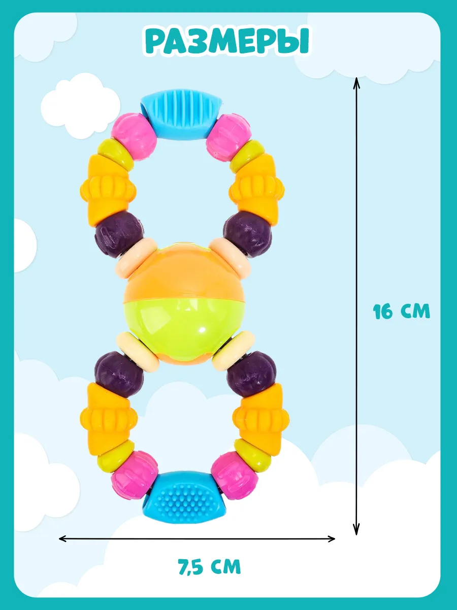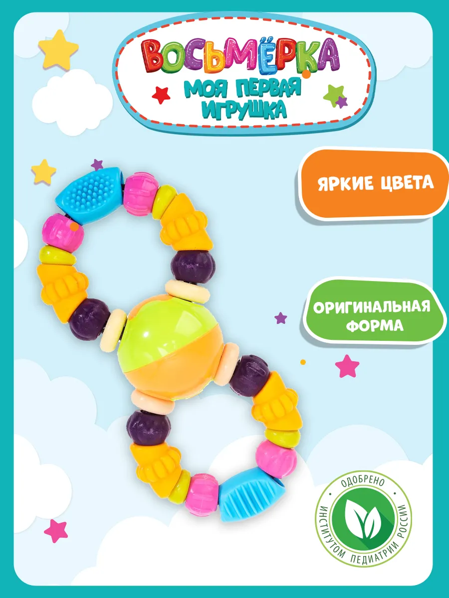 Развивающая игрушка Восьмёрка включает всё, что нужно для полноценного развития малыша. Яркие цвета и звуки трещотки пробудят интерес ребёнка к окружающему миру.