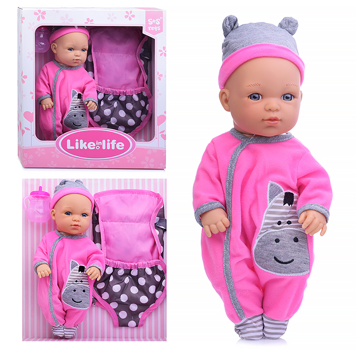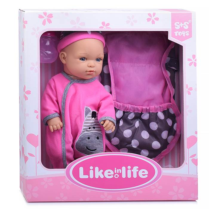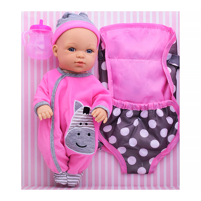 Милый пупс малышка обязательно станет постоянным участником сюжетно-ролевых игр ребёнка. Размер пупса - 30 см. Туловище игрушки пластмассовое; голова, ручки и ножки - из мягкого ПВХ. Части тела подвижные. Глазки не закрываются. Элементы одежды легко снять и одеть. Игрушка озвучена. Воспроизводит звуки: детский плач, детский смех и хохот, смешные звуки, похожие на речь. Пупсика можно купать, переодевать, брать с собой на прогулку. В комплекте аксессуары: бутылочка, рюкзак-кенгуру. Такая комплектация разнообразит игру и сделает её ещё интереснее и реалистичнее.