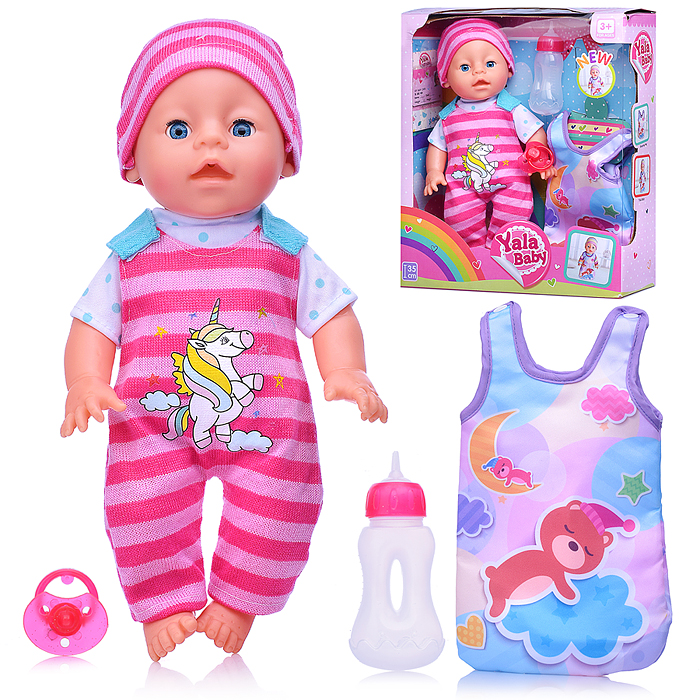Очаровательный малыш обязательно станет постоянным участником сюжетно-ролевых игр девочки. Размер пупса - 35 см. Туловище игрушки выполнено из пластика; голова, ручки и ножки - из ПВХ. Части тела подвижные. Глазки закрываются. Пупс одет в футболку с коротким рукавом, комбинезон и шапочку из вязаного трикотажа. Пупса можно купать, переодевать, менять подгузник, кормить, поить из бутылочки и садить на горшок. В комплекте аксессуары: соска, бутылочка, горшок, тарелочка, ложечка, подгузник, конверт для малыша. Такая комплектация разнообразит игру и сделает её ещё интереснее и реалистичнее.