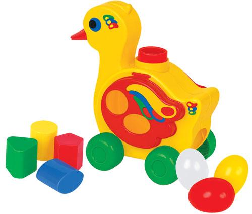 "Уточка-несушка" имеет яркую расцветку и объединяет в себе функции сортера и каталки. Наличие сортера позволяет ребёнку изучить форму и цвет, решая логическую задачу – подобрать отверстие для каждой фигурки.