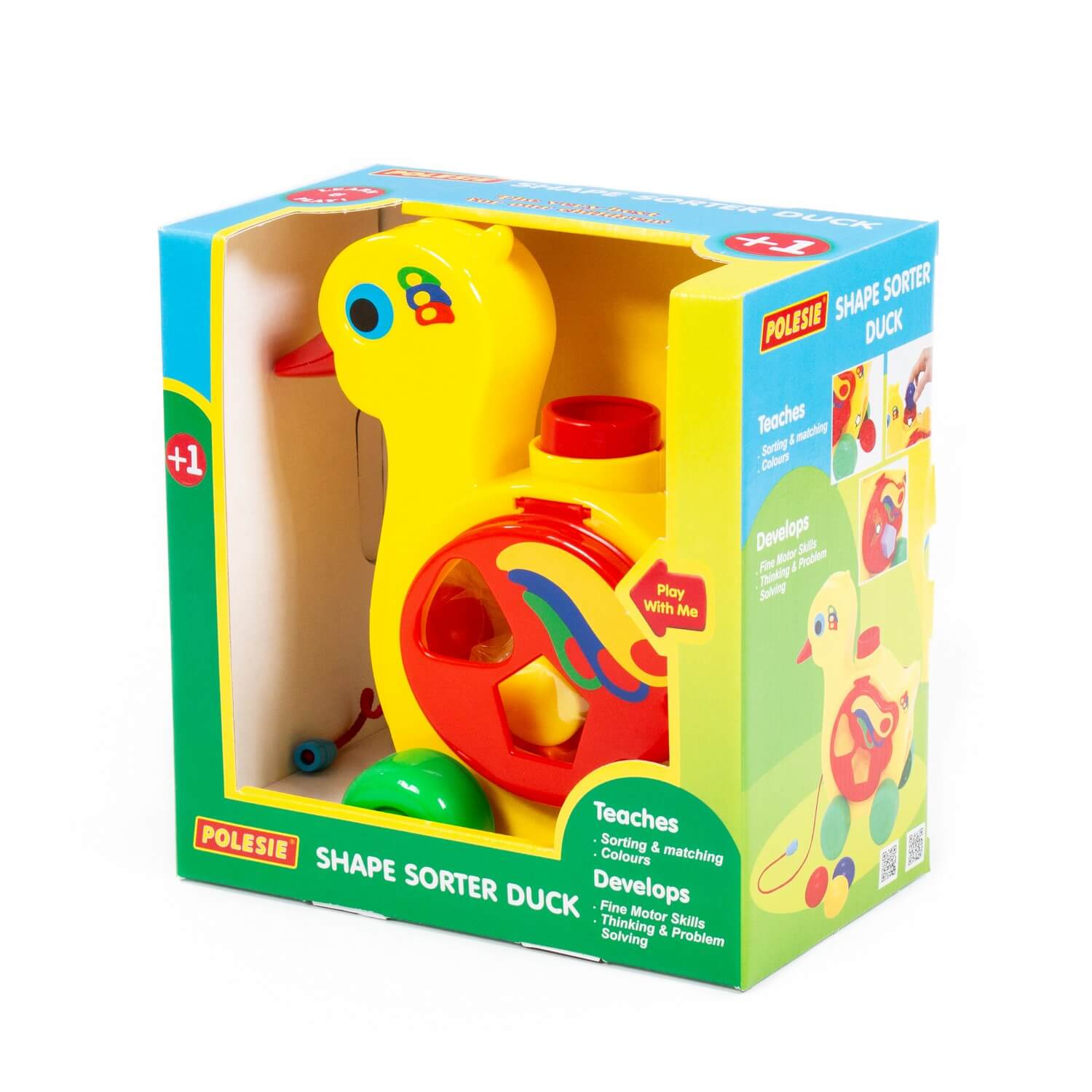 Уточка-несушка имеет яркую расцветку и объединяет в себе функции сортера и каталки. Наличие сортера позволяет ребёнку изучить форму и цвет, решая логическую задачу – подобрать отверстие для каждой фигурки. Возможность катать уточку делает игру еще интереснее, развивая при этом координацию движений малыша.